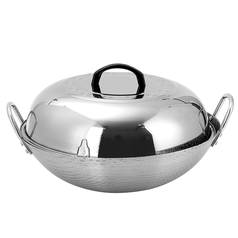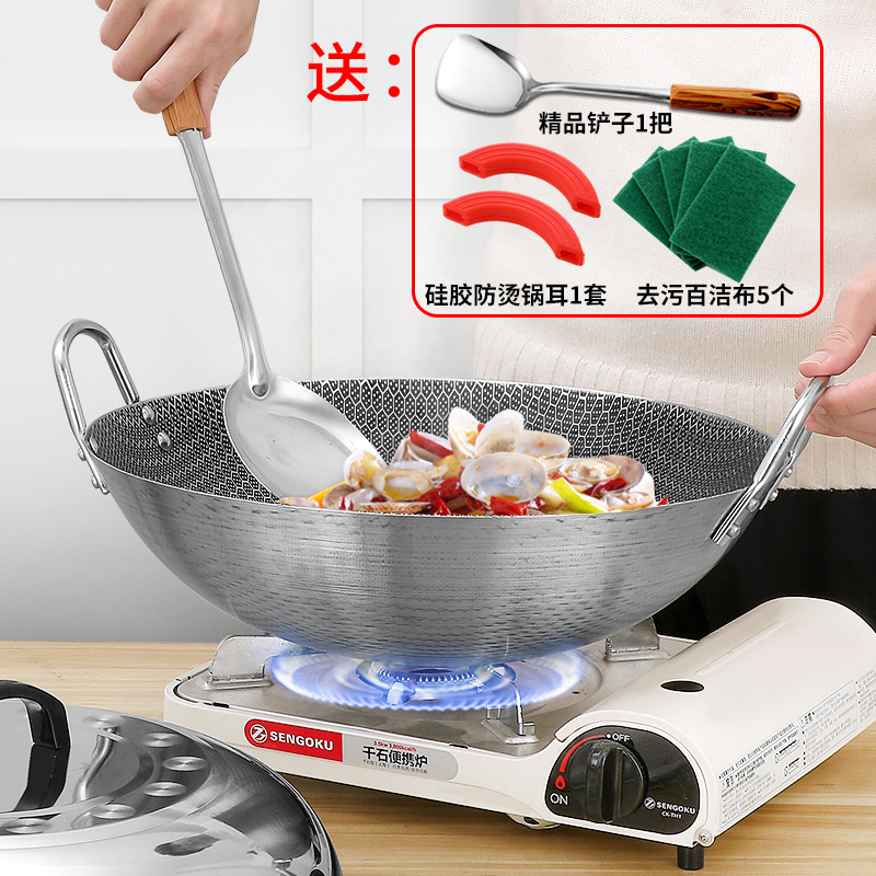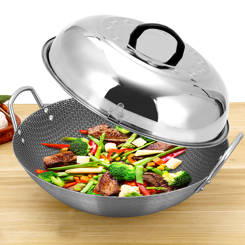 Stainless steel frying pan double ear steel pot kitchen honeycomb non-stick round bottom extra large frying pan large pot frying tripod gas