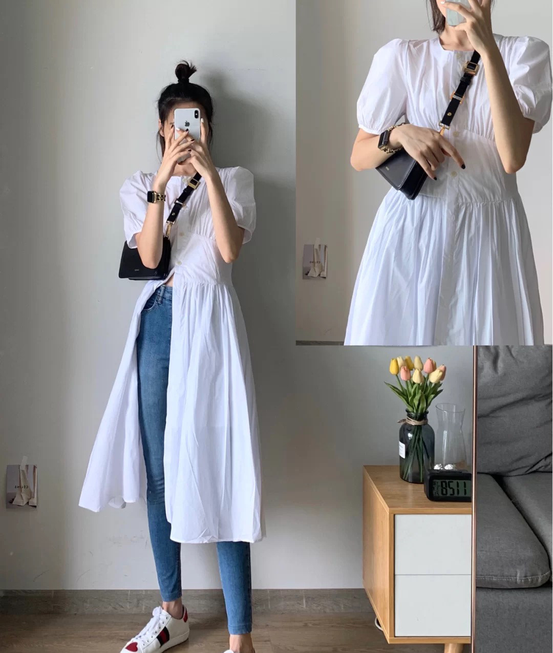 Han Mi Vegetable Bubble Sleeves White Tandem Dress European Station Women 2020 Autumn Winter New Tide Style High Waisted Temperament Skirt