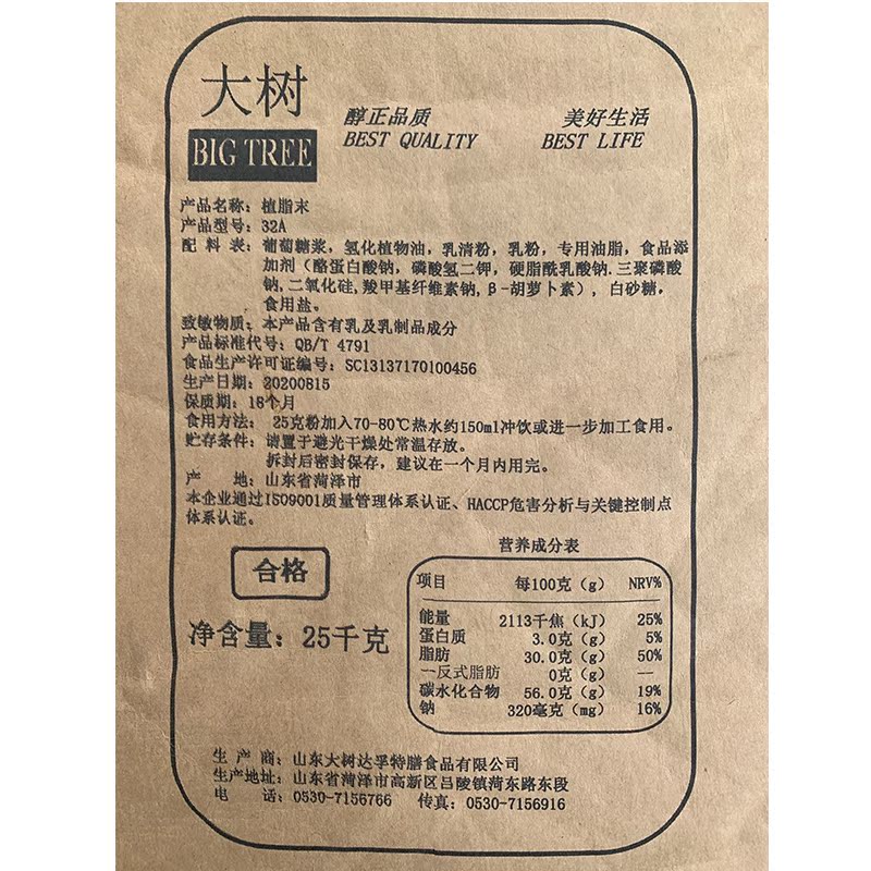 Large Tree 32A Vegetable Fat End 25kg Milk Tea Special Commercial Milk Fine Zero Trans Fatty Acid Chain Milk Tea Shop Raw Material