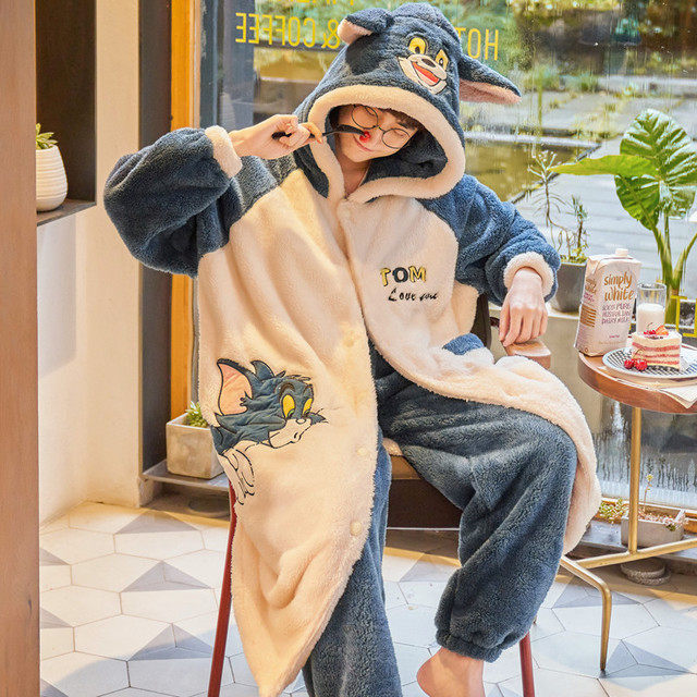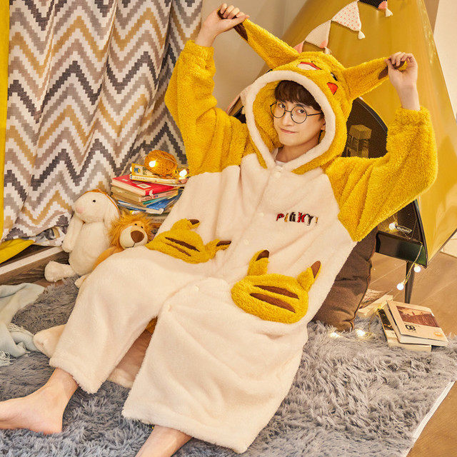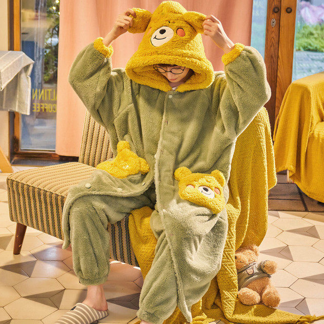 Winter men's pajamas pajamas winter plus velvet thickened long version teenager college students' home clothes bundle feet one-piece suit