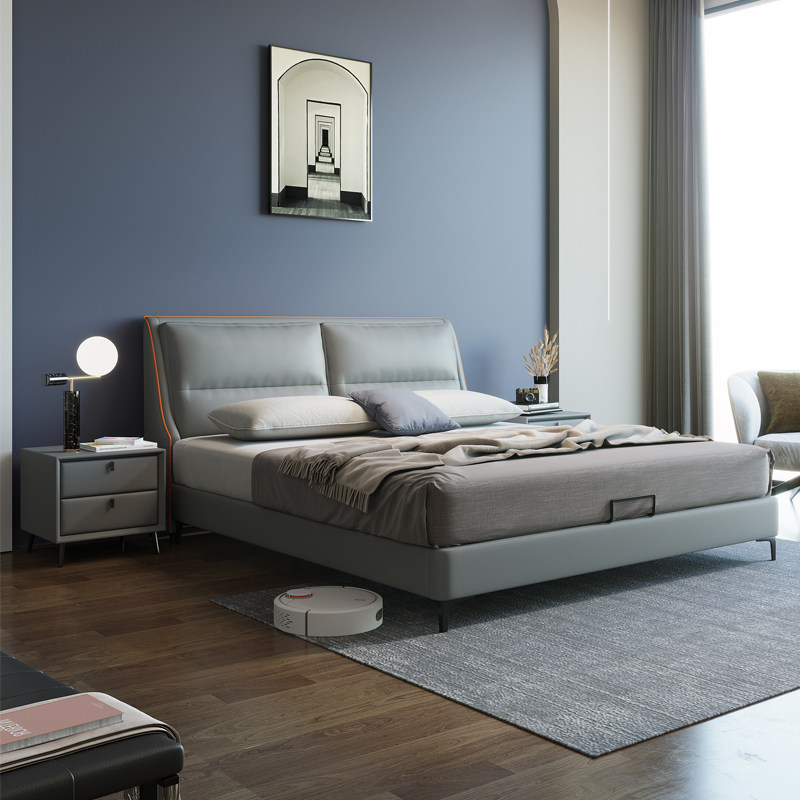 Nordic genuine leather bed modern minimalist tatami double man bed master bedroom with small and luxurious bed lins soft-bed dinghy with light lavish bed
