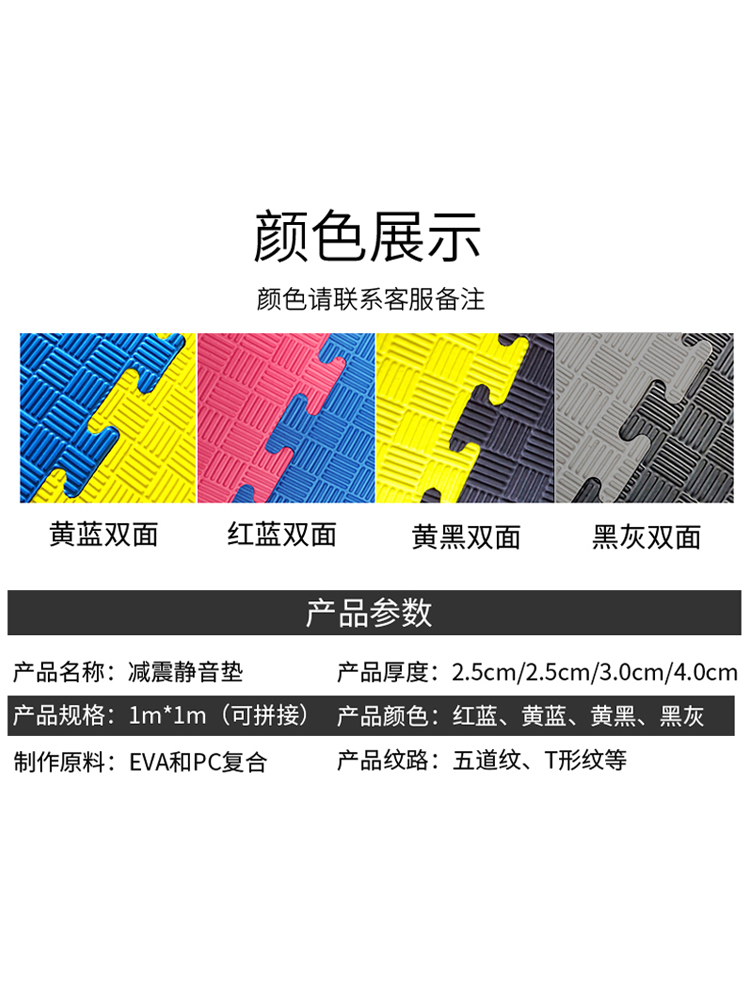 Sheetlet Thickness 2cm Length 1 m Width 1 m (Multi-color optional Next note) 『 Sound insulation 70% Single sheet Thickness 2.5cm Length 1 m wide 1 m (multi-color optional Next note) 『 Sound insulation 80% Single sheet Thickness 4cm length 1 m wide 1 m (multi-color optional next note) 『 Sound insulation 93% Single sheet Thickness 3cm length 1 meter wide 1 meter (multi-color optional next note) 『 Sound insulation 88% Thickness 2cm length 2 meters length 1 meter width 1 meter Yellow and blue 『 Sound insulation 70% 』 Thickness 2cm length 2 meters width 1 meter Red and blue 『 Sound insulation 70% 』 Thickness 2cm Length 2m Width 1 m Yellow Powder 『 Sound Insulation 70% 』 Thickness 2cm Length 2m Width 1m Black Ash 『 Sound Insulation 70% 』 Thickness 2.5cm Length 2m Width 1m Yellow Blue 『 Sound Insulation 80% 』 Thickness 2.5cm Length 2m Width 1m Red Blue 『 Sound Insulation 80% 』 Thickness 2.5cm Length 2m Width 1m Black Ash 『 Sound Insulation 80% 』 Thickness 2.5cm Length 2m Width 1m Black And Yellow " Sound Insulation 80% 』 Thickness 3cm Length 2m Width 1m Yellow Blue 『 Sound Insulation 88% 』 Thickness 3cm Length 2m Width 1m Red And Blue 』 Sound Insulation 88% Thickness 3cm Length 2m Width 1m Black Ash 『 Sound Insulation 88% 』 Thickness 3cm Length 2m Width 1m Black Yellow 『 Sound Insulation 88% 』 Thickness 4cm Length 2m Width 1m Yellow Blue 『 Sound Insulation 93% 』 Thickness 4cm Length 2m Width 1m Red Blue 『 Sound Insulation 93% 』 Thickness 4cm Length 2m Width 1m Black Yellow 『 Sound Insulation 93% 』 Thickness 4cm Length 2m Width 1m Black Ash 『 Sound Insulation 93% 』 Treadmill Mat (12*8*2cm) 6 Pieces Of Hot Compression Rubber Material