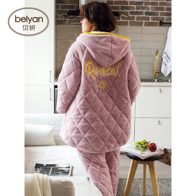 Belyan Winter Thickened Triple Coral Suede Bunk Cotton Pyjamas Lady Cute Warm And Hat Cotton Padded Jacket Suit Suit