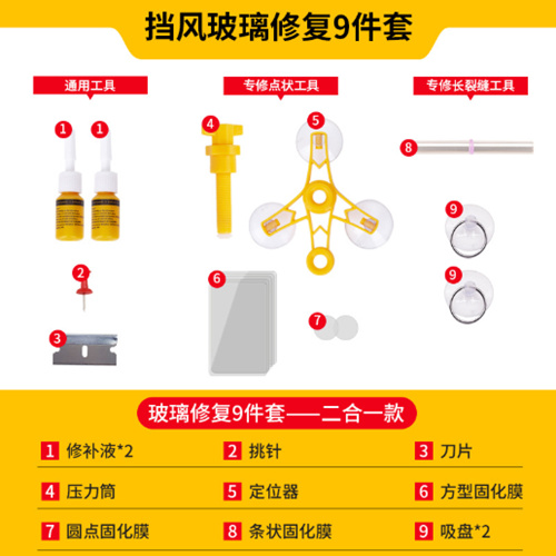 Repair liquid additive (without tools) 1 Bull Eye Repair Fluid (with tool) 1 Suit Crack Repair Fluid (with tool) 1 Suit Bulleye Crack Repair Fluid (with tool) 1 suit