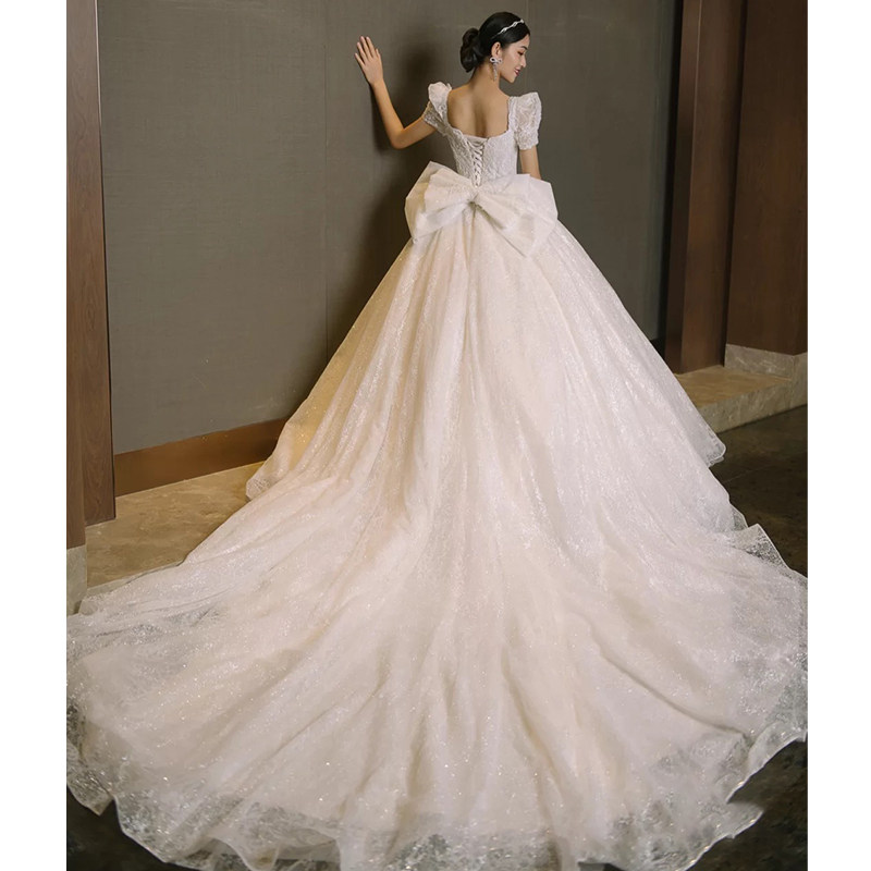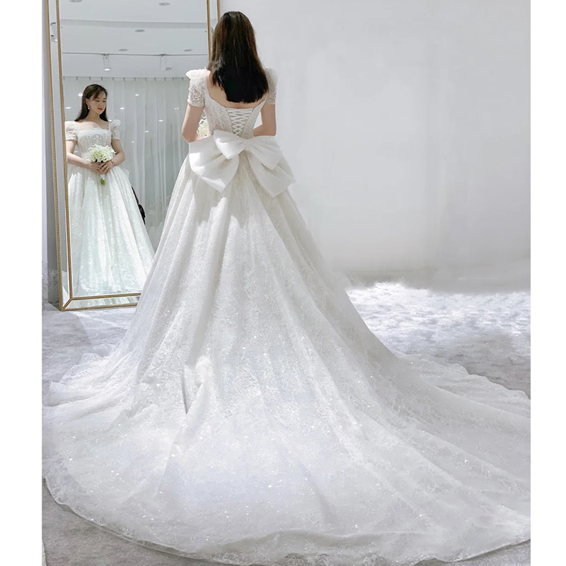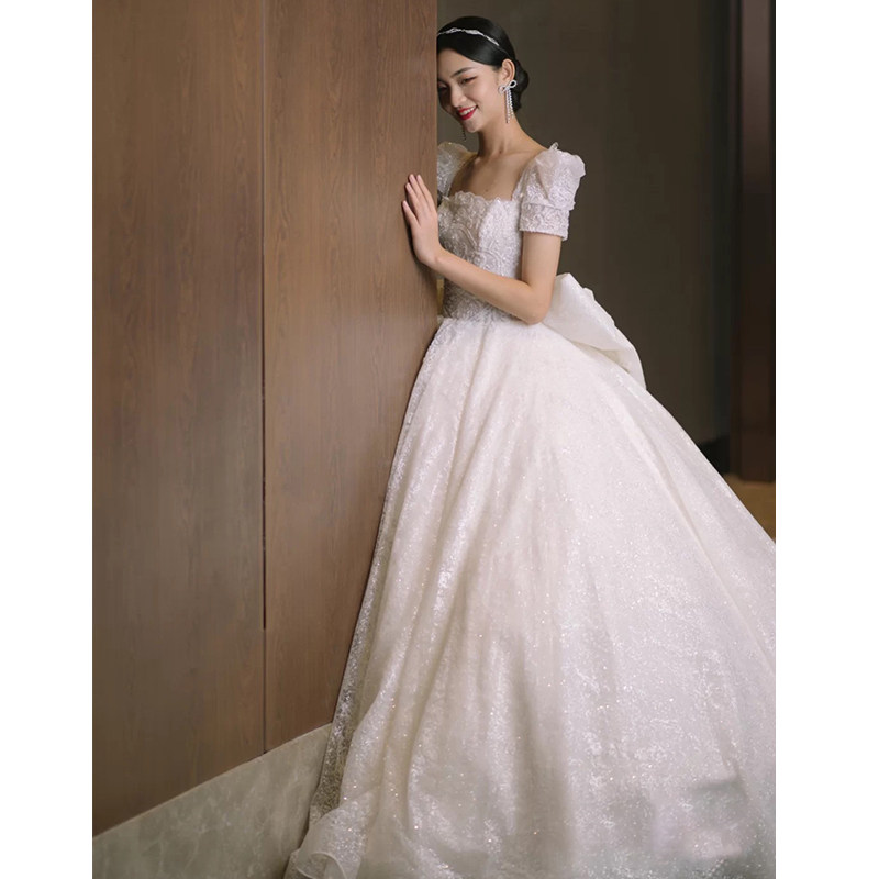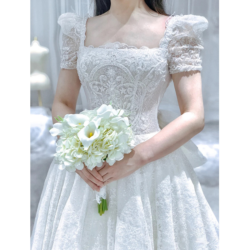 French light main wedding dress 2021 new bride square collar tail forest department super fairy dream small man Qi Di simple woman