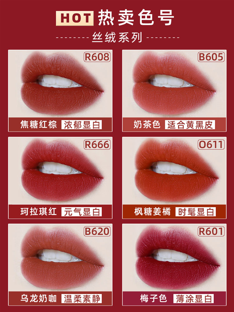 Velvet Air Lip Glaze R608 Caramel Red Brown Velvet Air Lip Glaze R601 Plum Color Velvet Air Lip Glaze B605 Milk Tea Color Velvet Air Lip Glaze B606