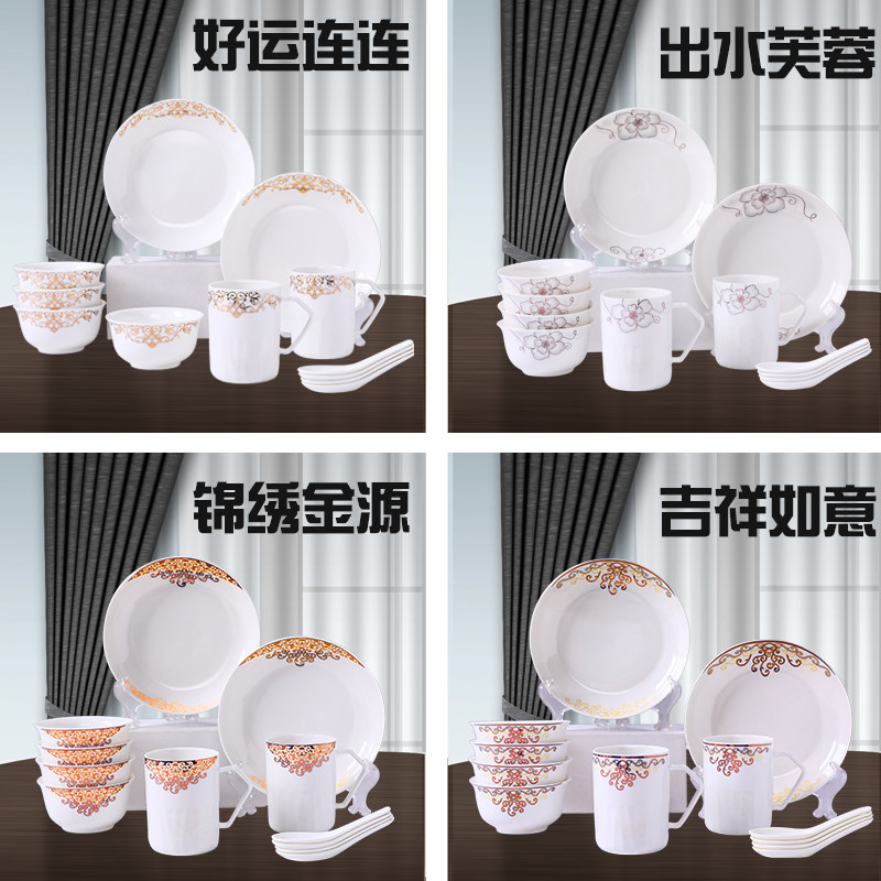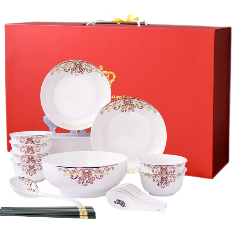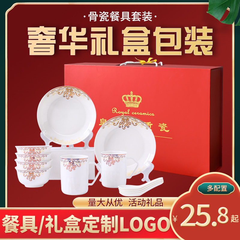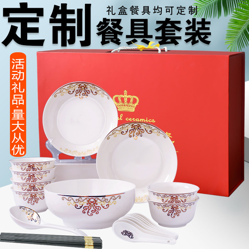 Custom ceramic dishes Dish Suit Printed Logo bone Porcelain With Cup With Chopsticks Cutlery Gift Box Real Estate Insurance Gift