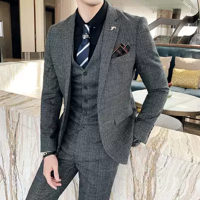 Plaid suit men's suit slim formal suit men's casual host suit Korean version of the trend groom wedding dress