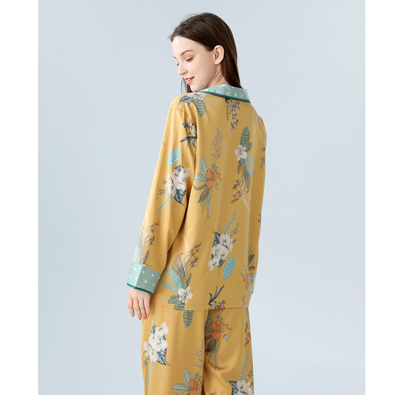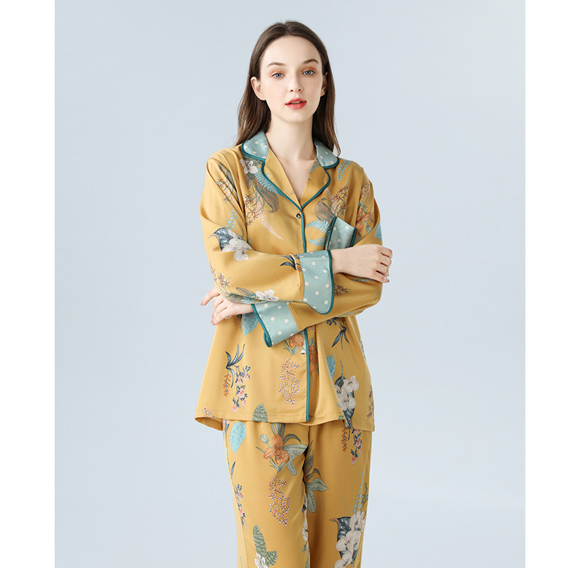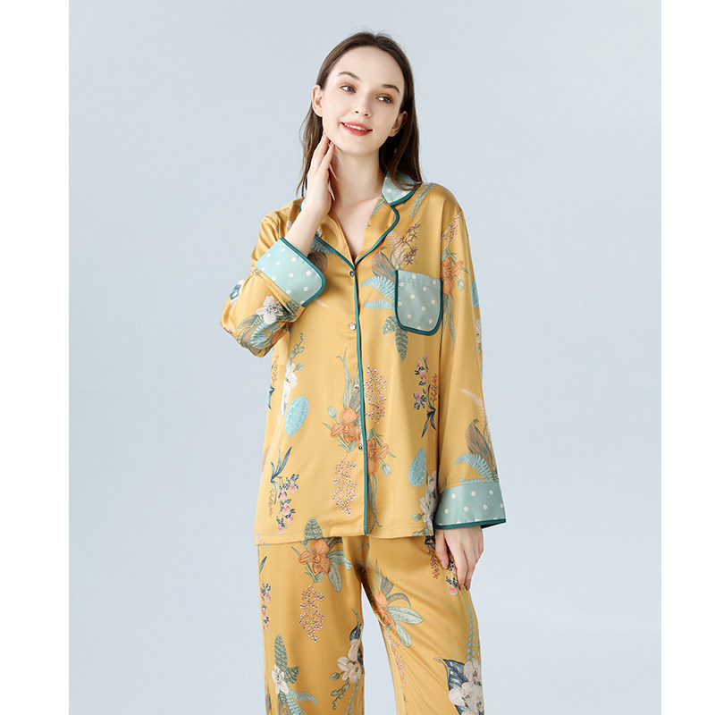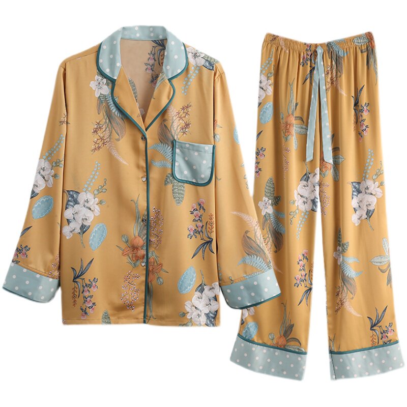 IIZZINI 2022 pyjamas women's spring and autumn long sleeves ice silk national wind yellow Shu sunflower luxurious long pants home suit suit