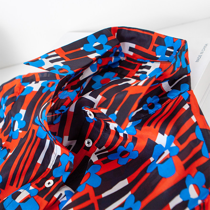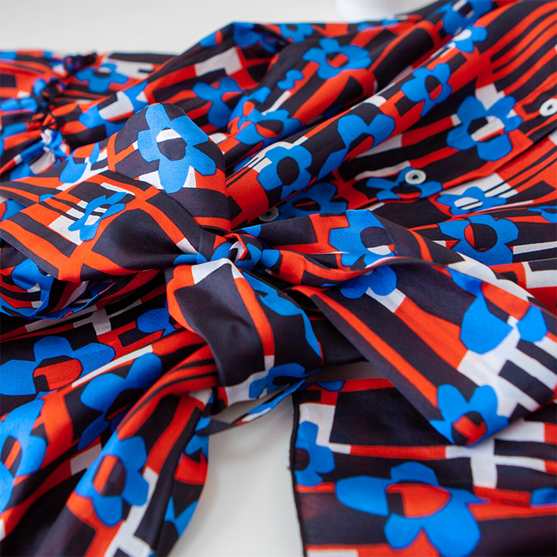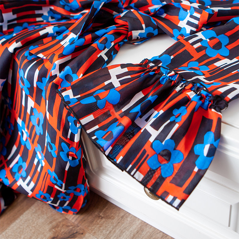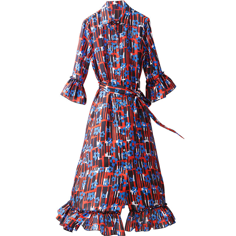Retro red blue printed shirt collar lacing to collect waist in long version of lotus leaf lace cake swing thin genuine silk dress x