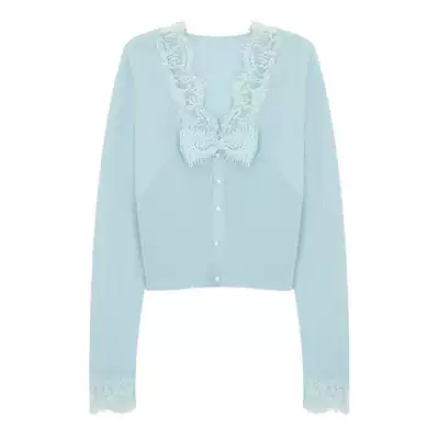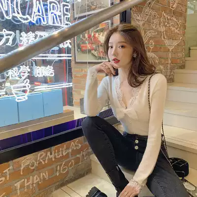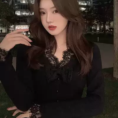 Van Gogh lace bottoming shirt women's spring and autumn season with sexy slim-fitting machine bow knitted sweater women's top