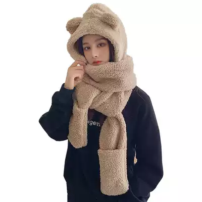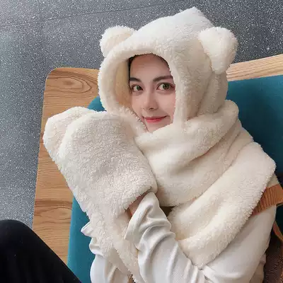Winter lambskin pink girl heart bear scarf hat one-piece bib Korean version wild cute plush warm