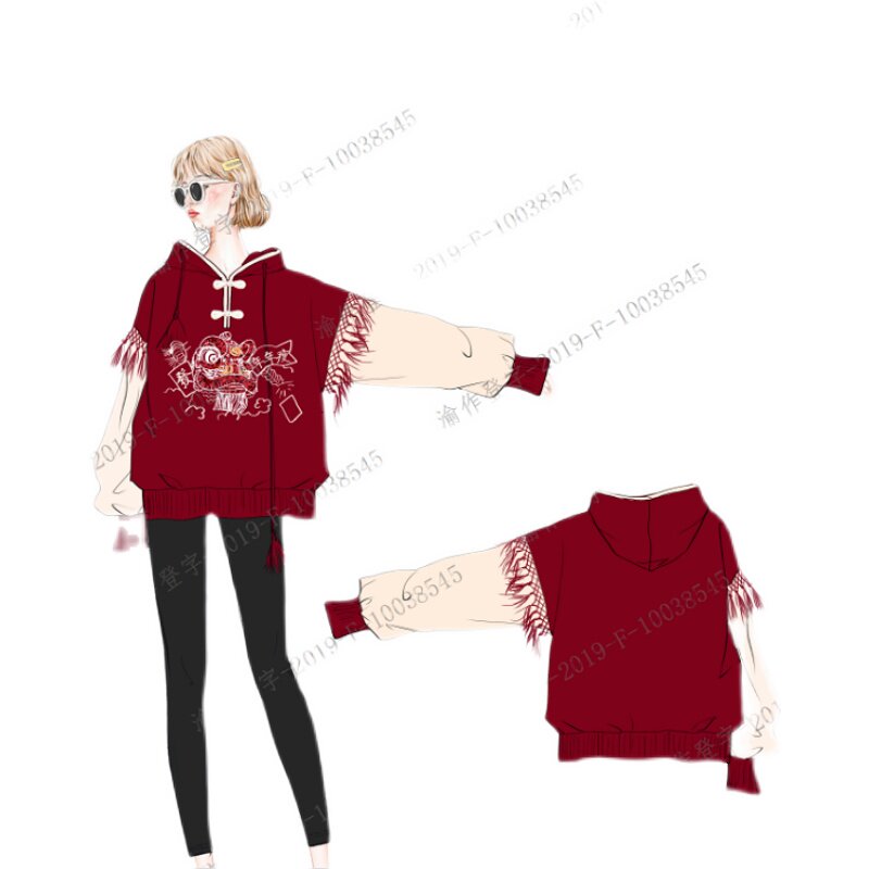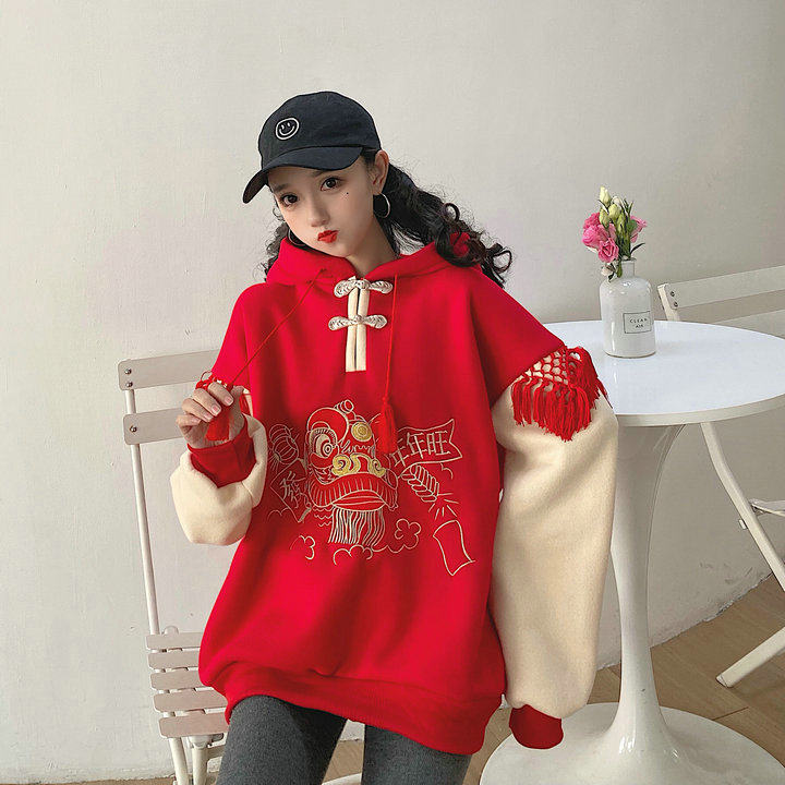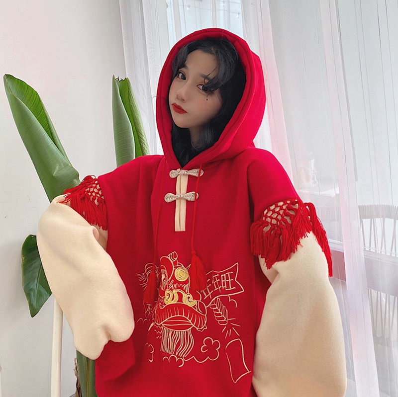 Chinese style ins super hot Tang suit improved hooded plus velvet loose sweater zodiac year red women's New Year's clothing winter
