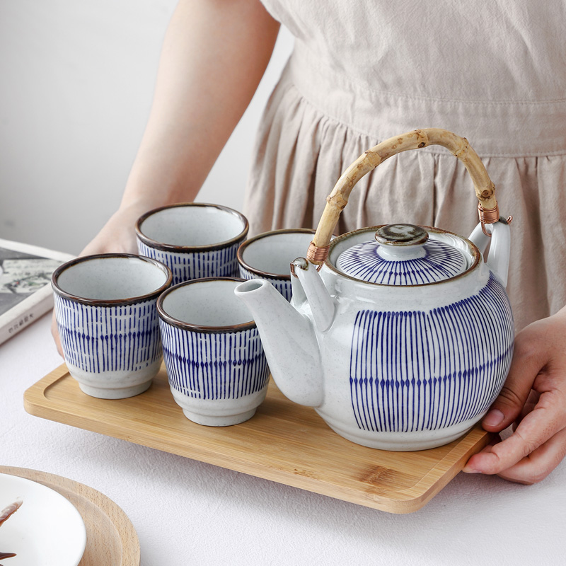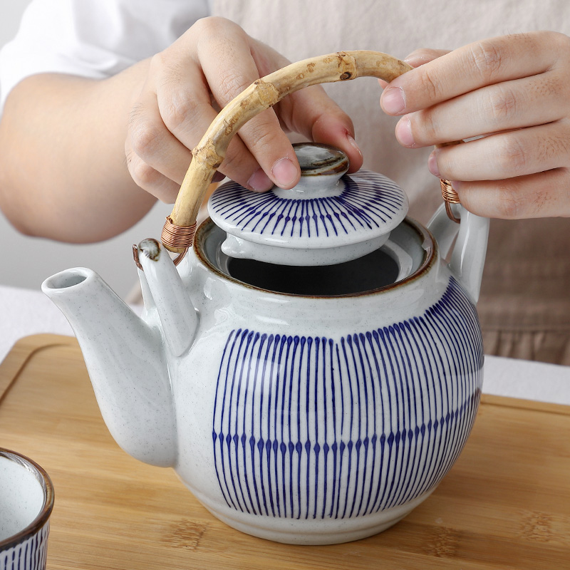 Day Style Blue Rain Tea Set Ceramic Large Teapot Tea Cup Suit Vines Bar Handle Teapot Dining Room Home With Wooden Care Tray