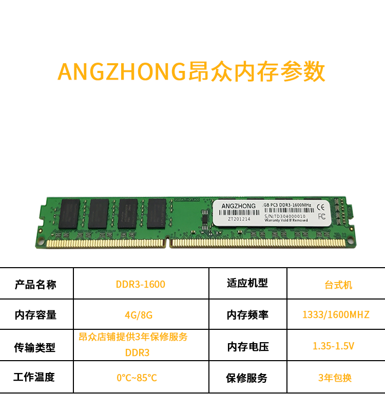 New Angzhong memory DDR3 4G 8G 1600 desktop computer magnesium light original particle video memory 3 years replacement
