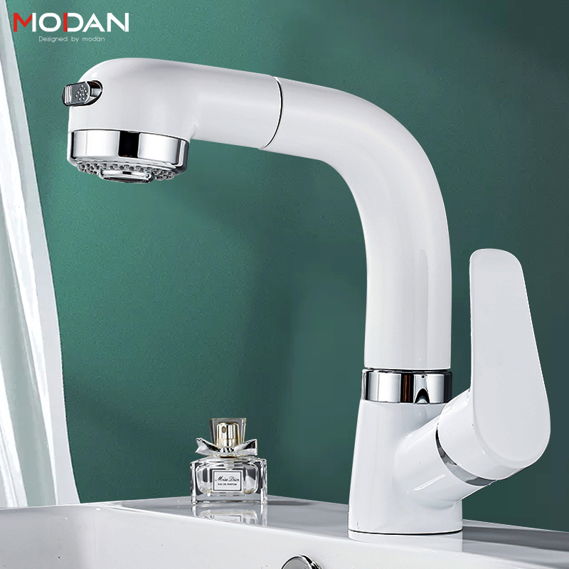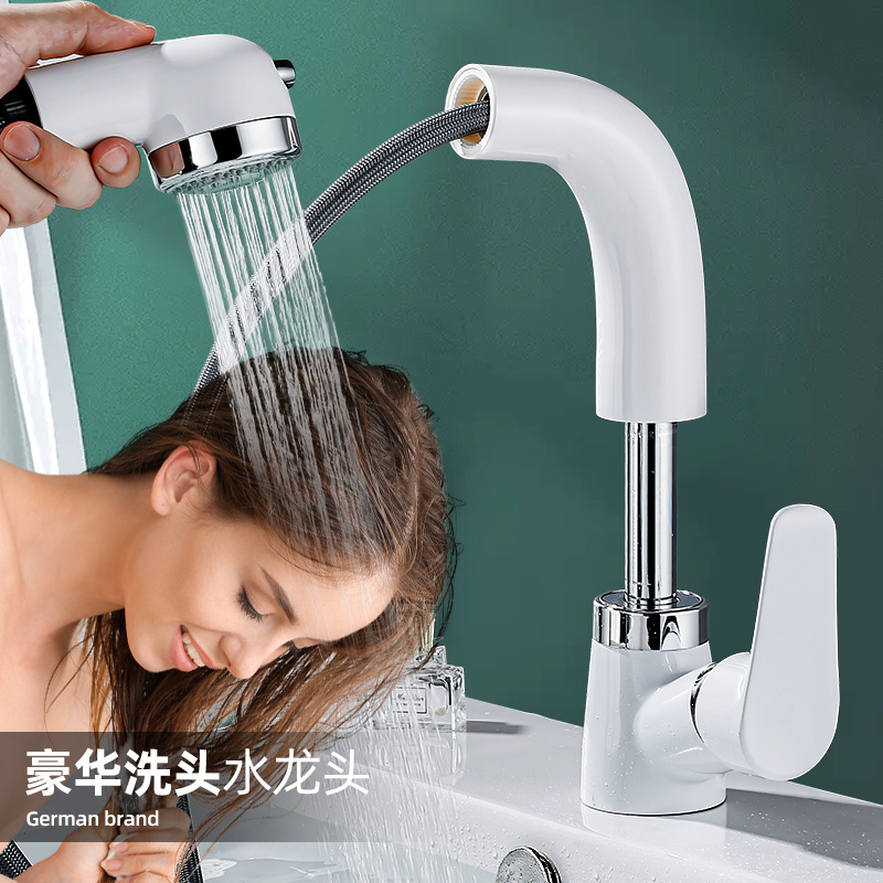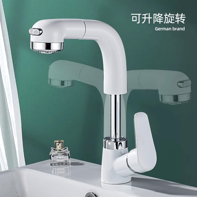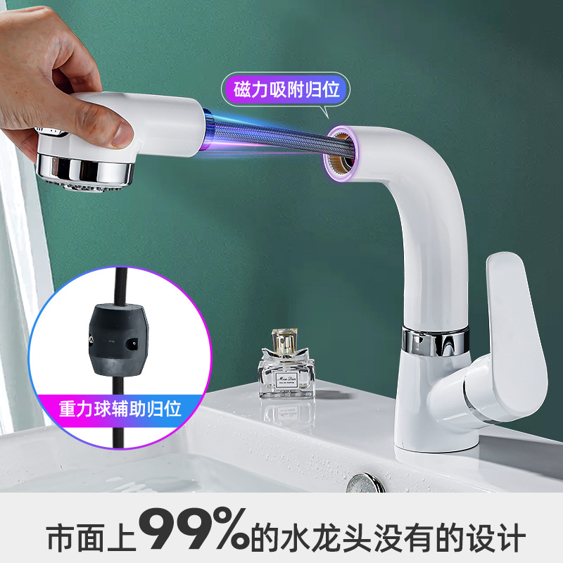 Japanese-style pull-out basin faucet hot and cold all-copper washbasin single-hole lift telescopic shower white powder room