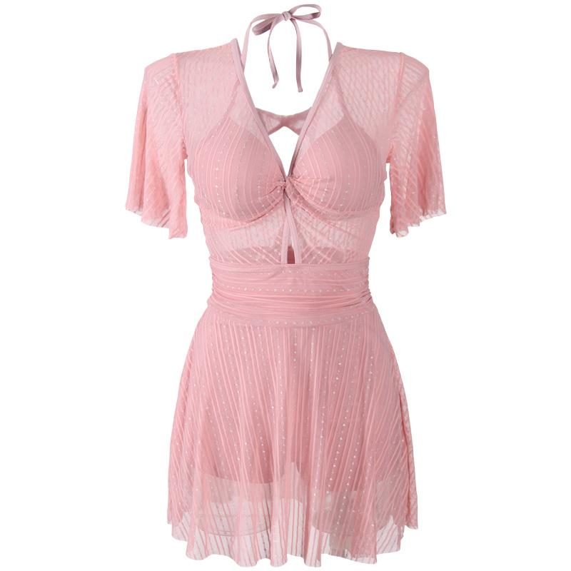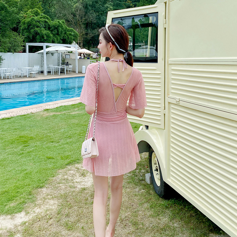 2021 summer new one-piece dress conservative flat angle steel support small chest gathered to cover the belly thin short-sleeved hot spring