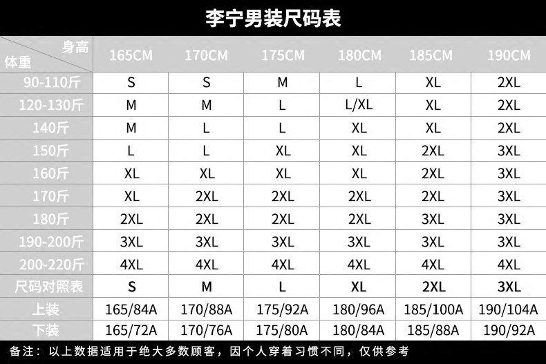 S(165 72A) M(170 76A) L(175 80A) XL(180 84A) XXL(185 88A) XXXL(190 92A)