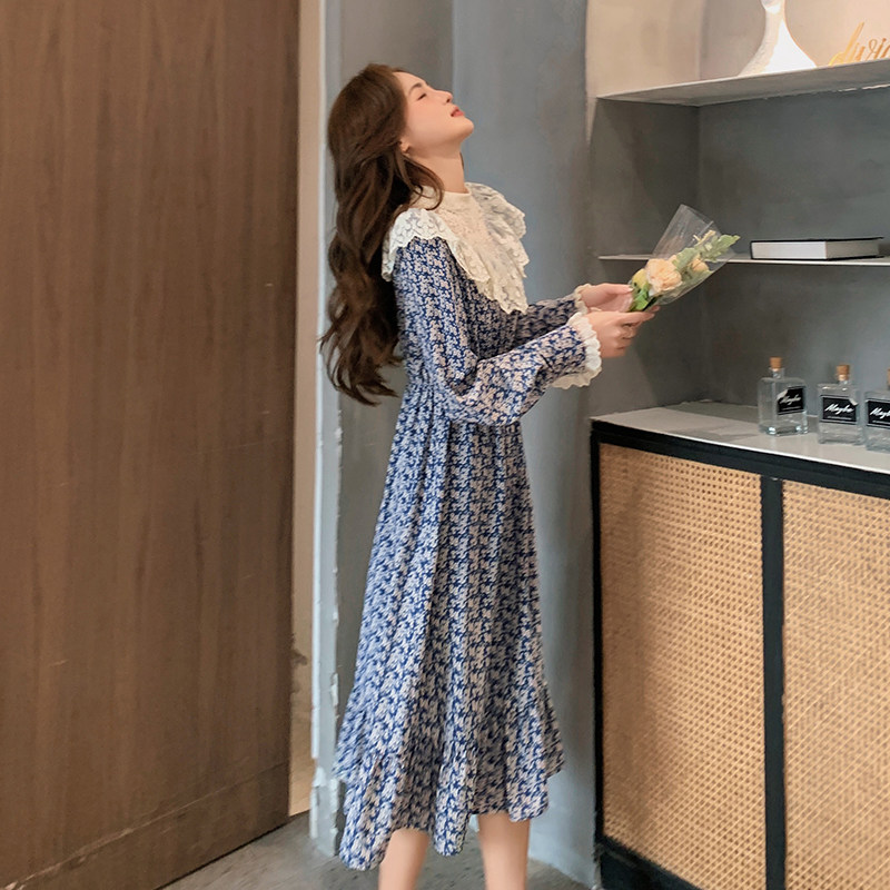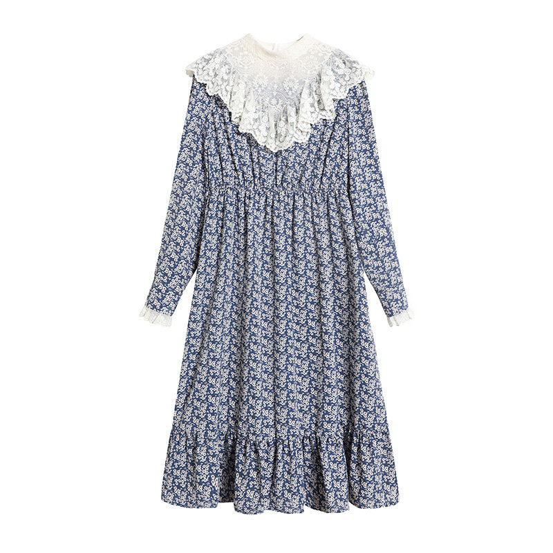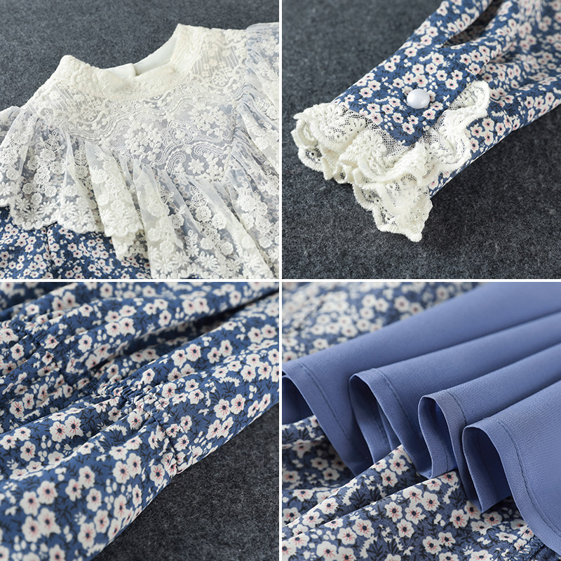 Blue language large size women's clothing fat sister mm temperament lace floral fairy skirt 2022 early autumn new waist dress