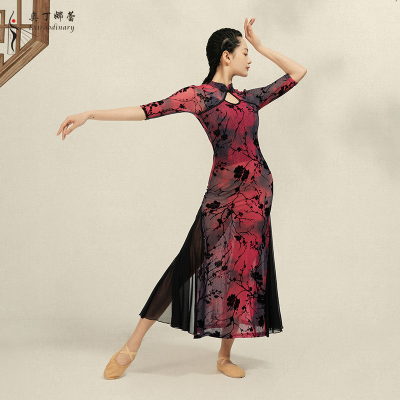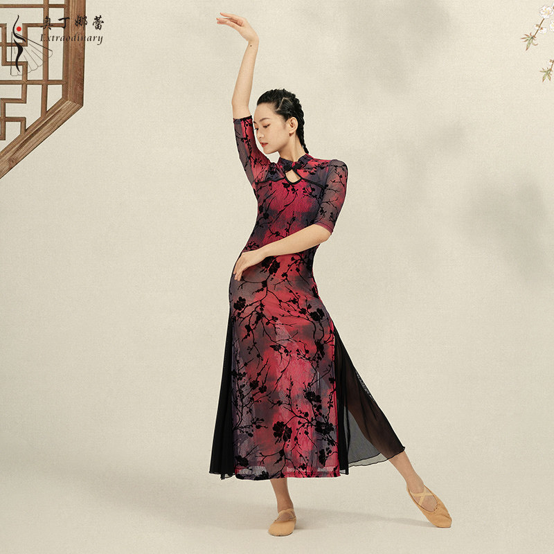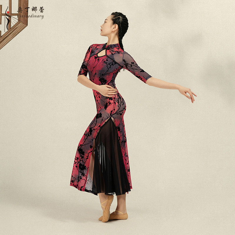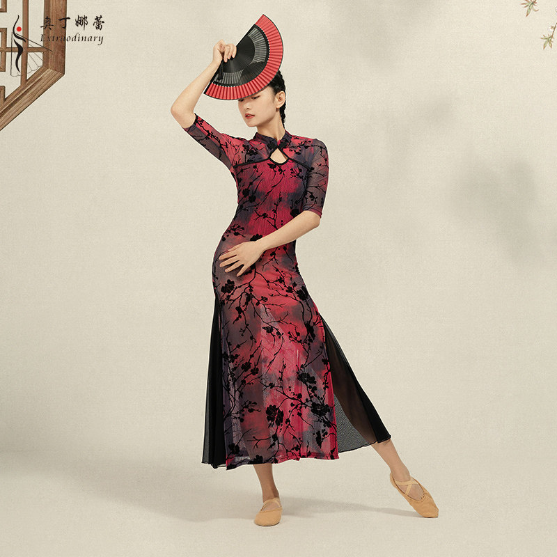 Classical cheongsam slit Chinoiserie dance elegant flowing performance catwalk performance printed mesh dress costume