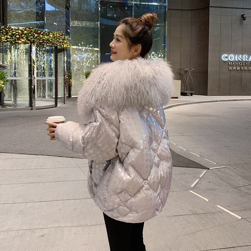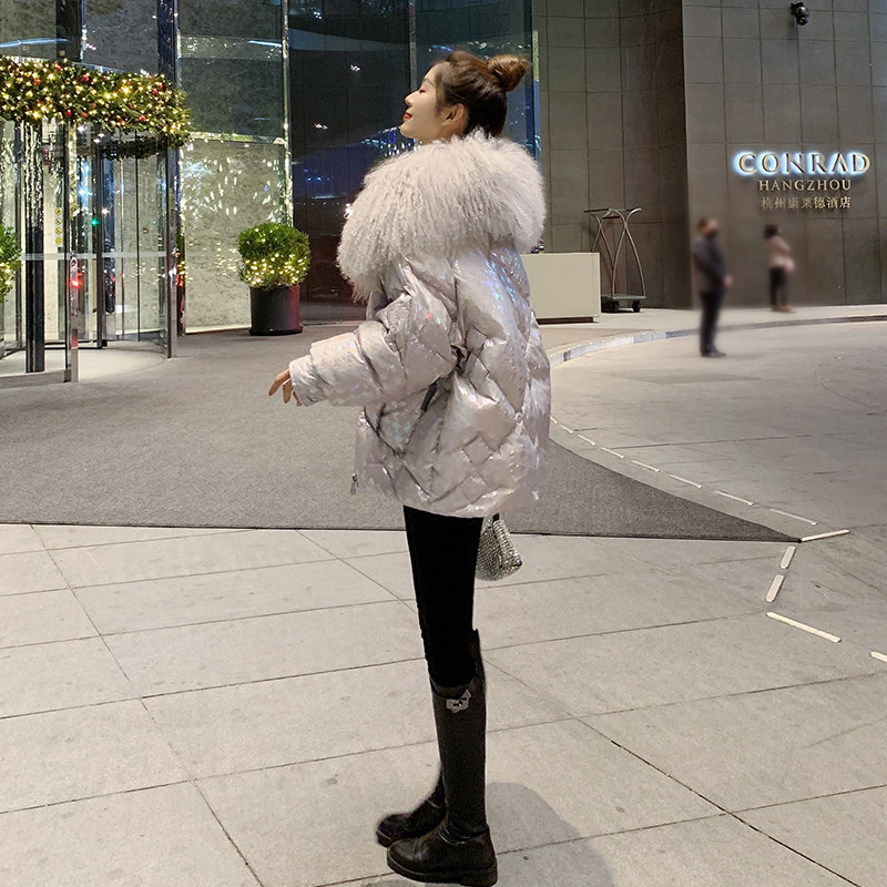 High-end big fur collar glossy down jacket women 2021 winter wear new short small man fashion dazzling coat tide