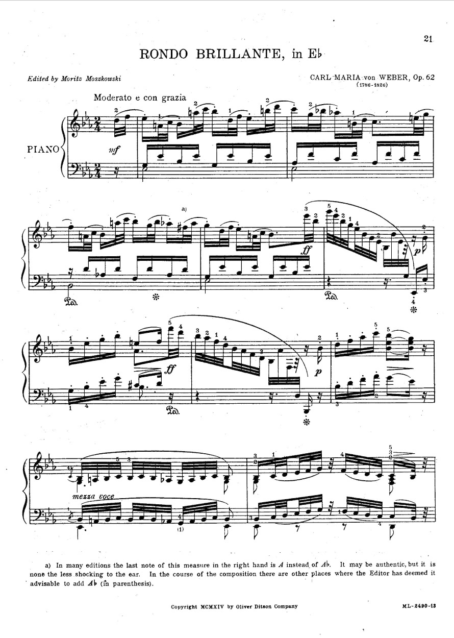 Weber Gorgeous Rondo piano score with fingering OP62 original version-13 pages