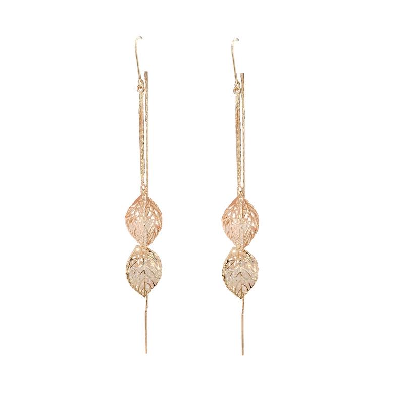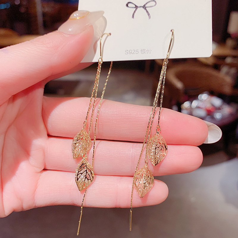 s925 silver needle hollowed-out solid one leaf storm rich flow Su anti-lose ear necklace Korean temperament net red fashion long version earrings