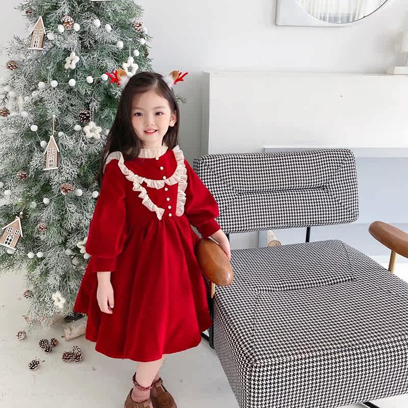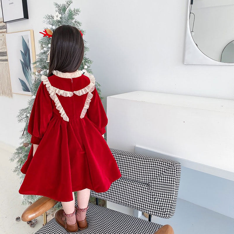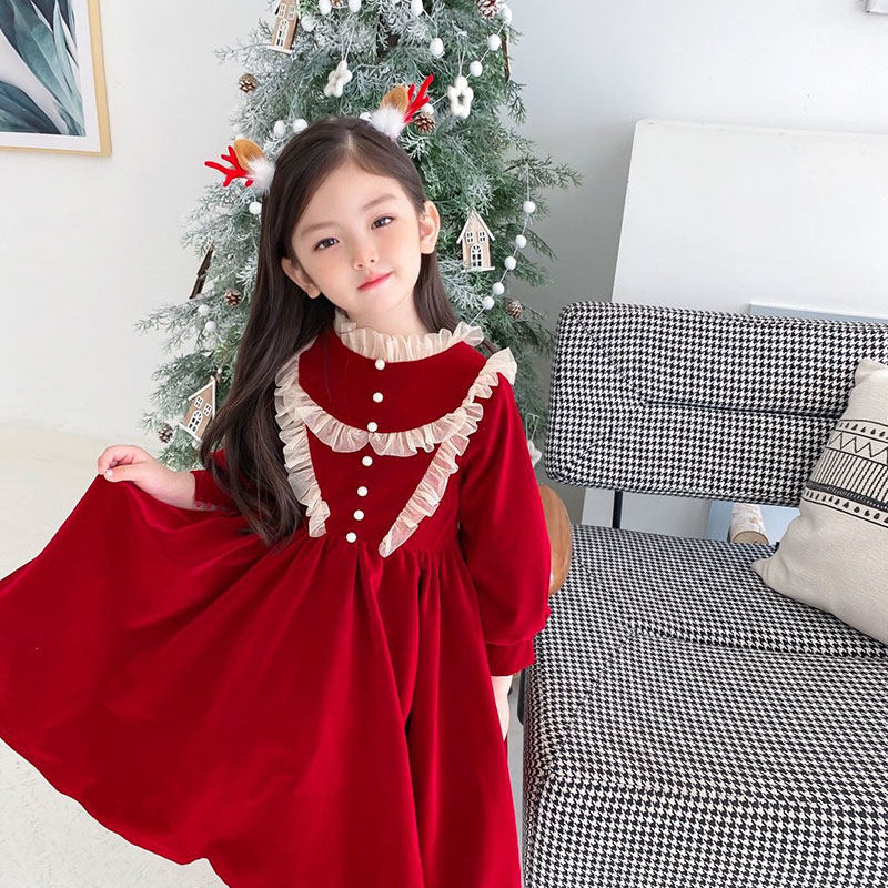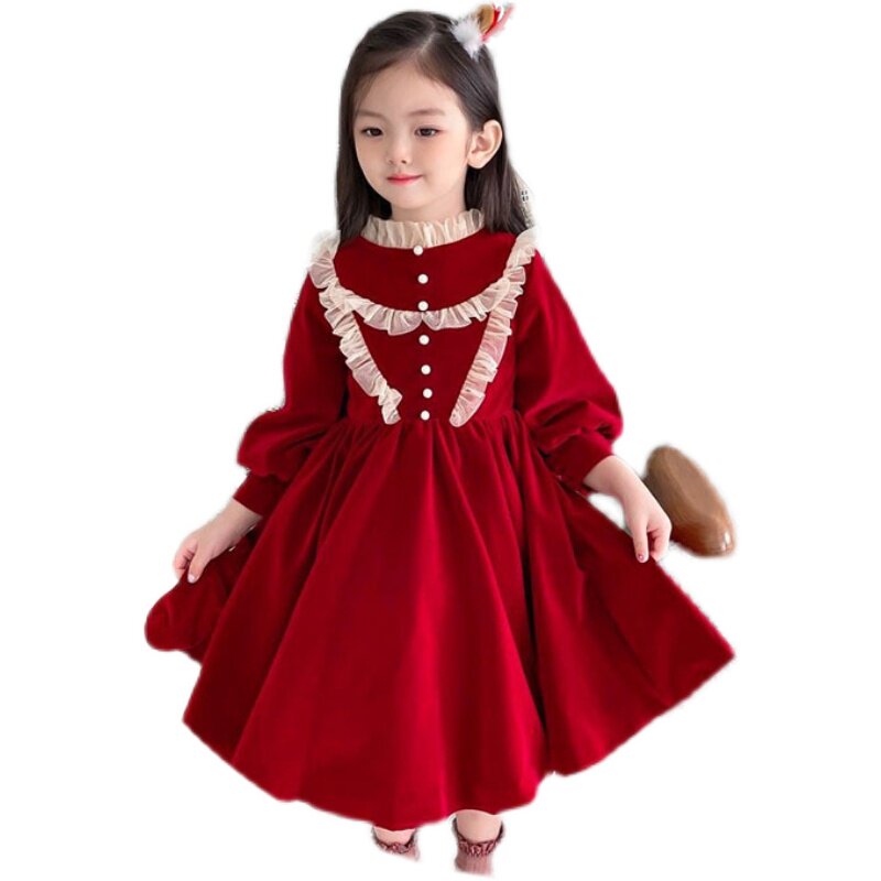 Autumn Winter new children Long sleeves Ocean Dress Girl Red Foreign Pie Birthday Christmas Velvet Pompeo Princess Dress