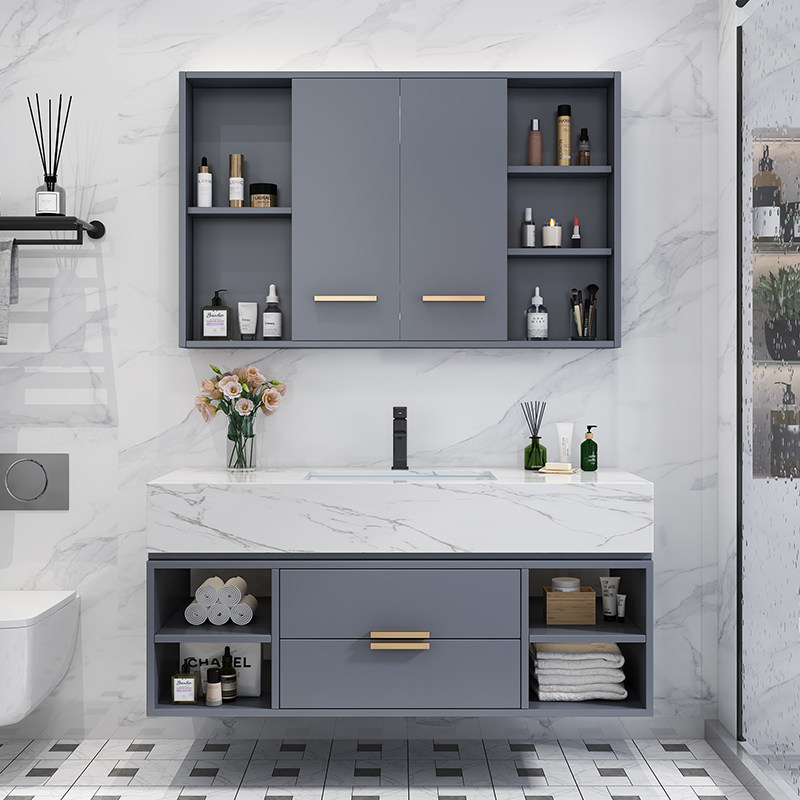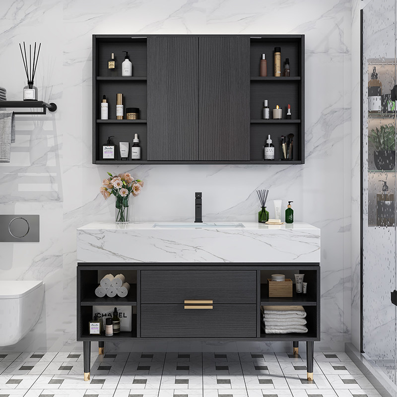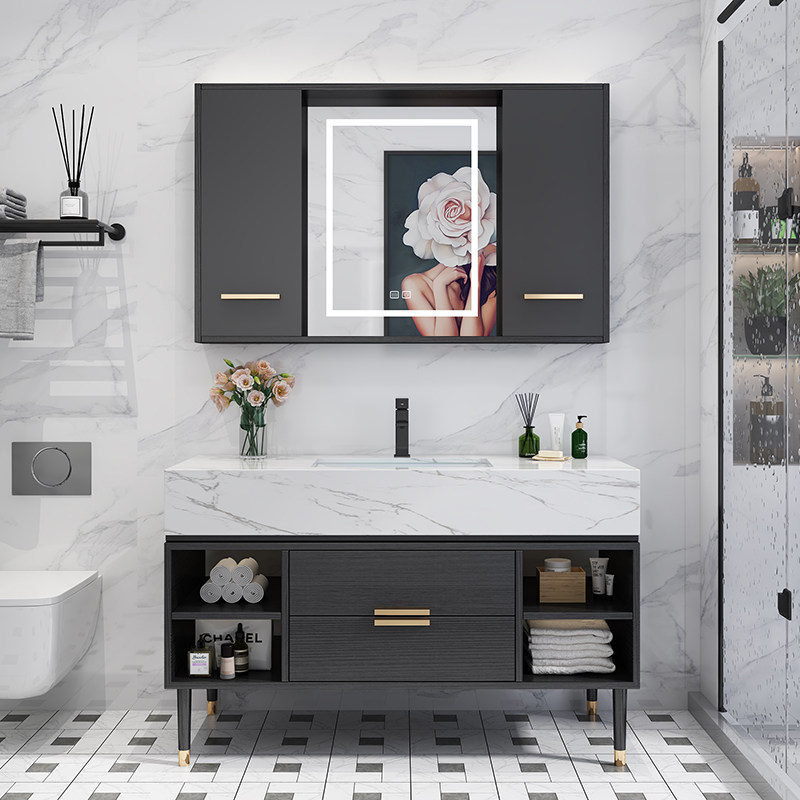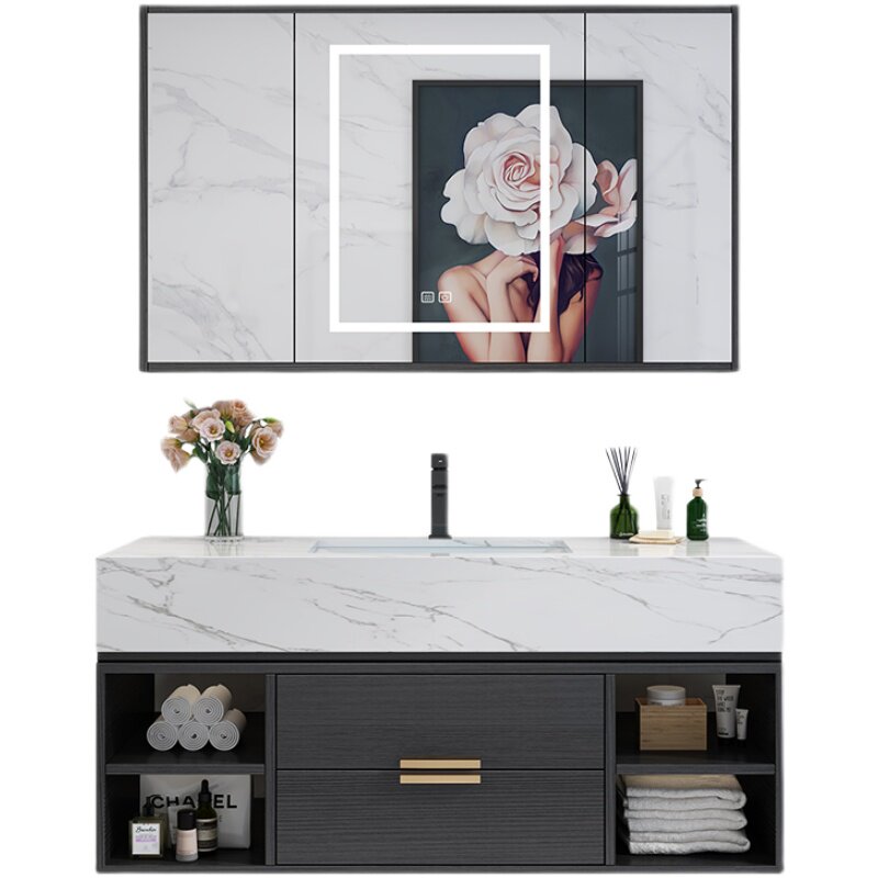 Light luxury solid wood smart hidden Fengshui mirror bathroom cabinet combination artificial stone countertop rock slab washstand washbasin