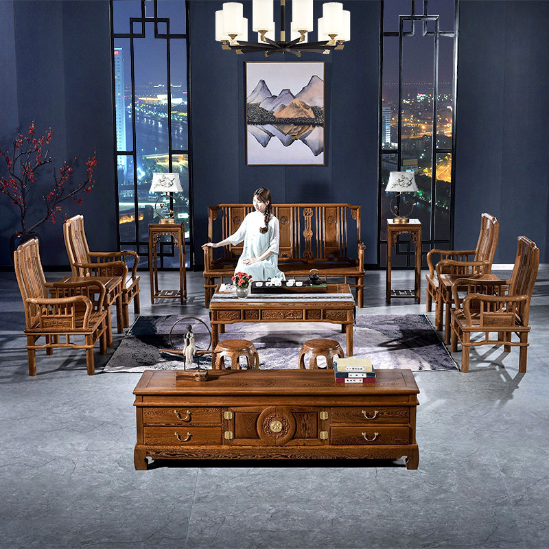 Redwood furniture chicken fin wooden sofa ten piece set combined living room Chinese solid wood small household sofa chair three-person seat