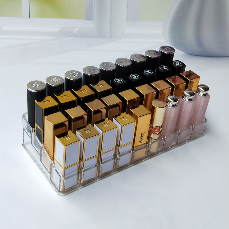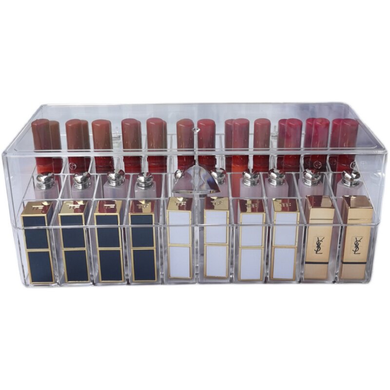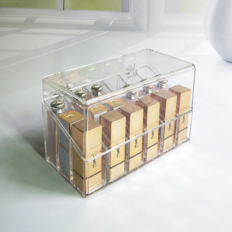 Table top with Dogmouth red lipstick lip gloss cosmetics containing box transparent acrylic display shelf finishing lipstick