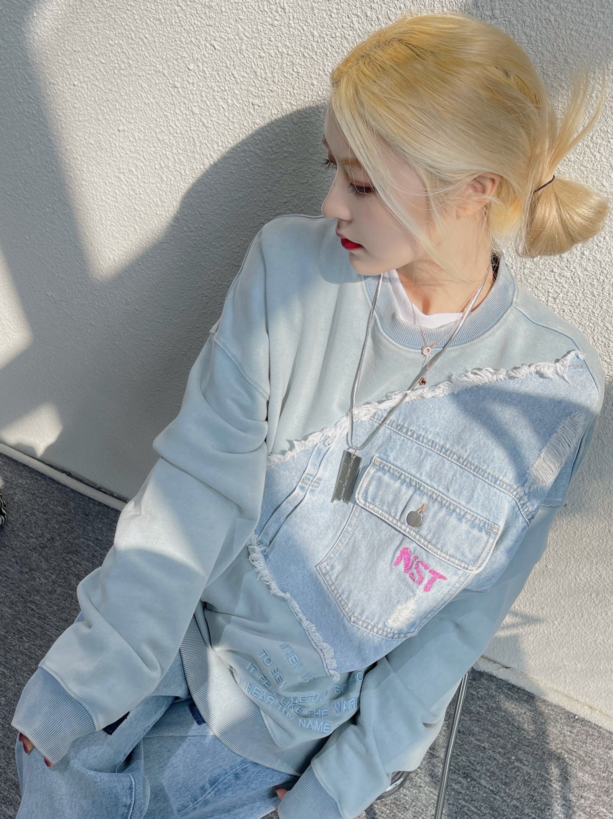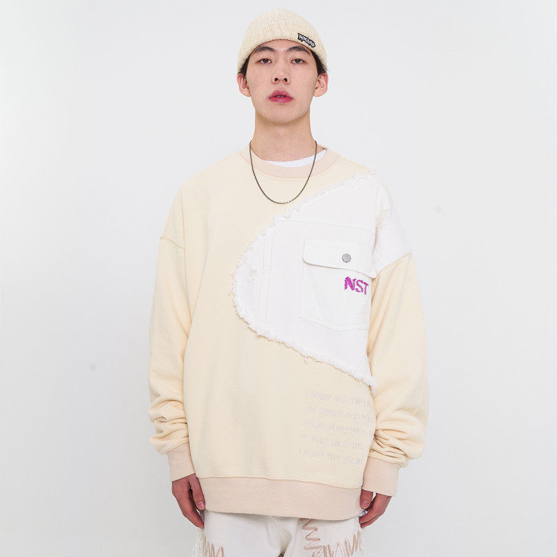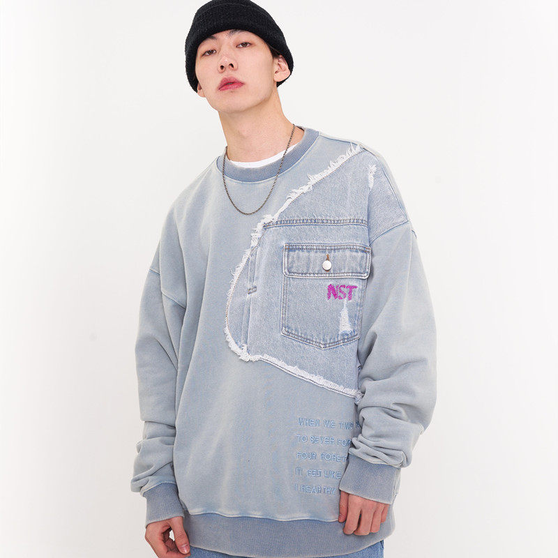 NSTNEW START denim stitching top men's and women's national tide brand embroidered terry loose round neck long-sleeved thick cotton T autumn