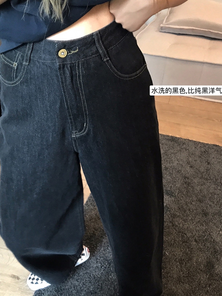 Autumn and winter plus velvet large size straight loose denim trousers women's crotch thigh thick pants fat mm thin high waist wide pants
