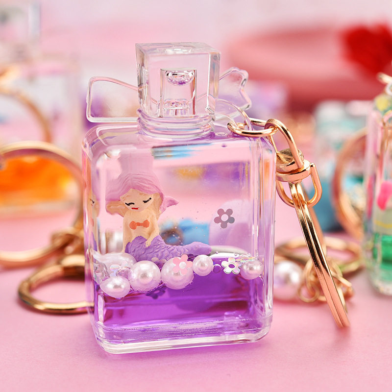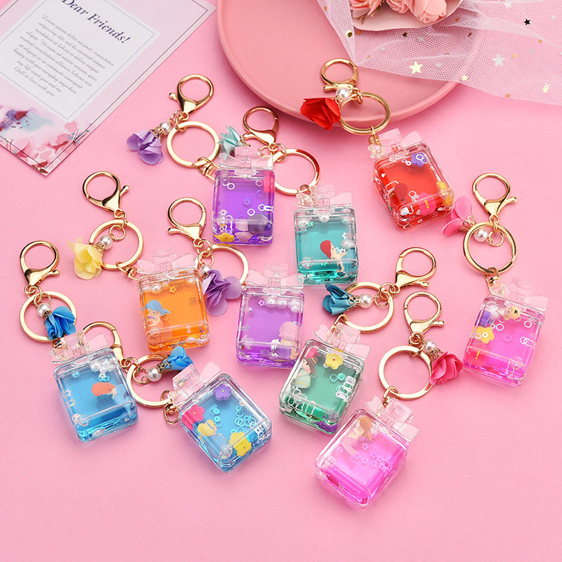 Acrylic creative small flower mermaid liquid quicksand bow perfume bottle car key chain baby bag pendant