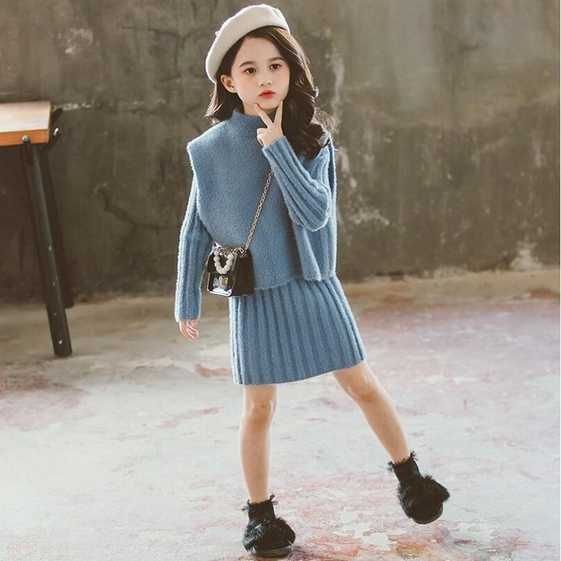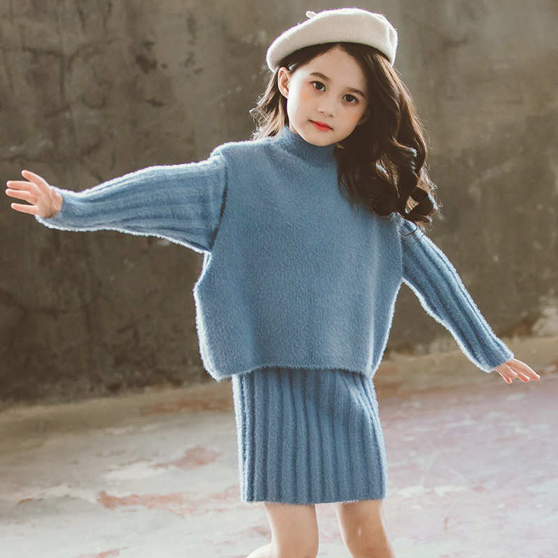 Hong Kong girls dress set autumn and winter 2021 new little girl medium long version turtleneck sweater set two-piece set