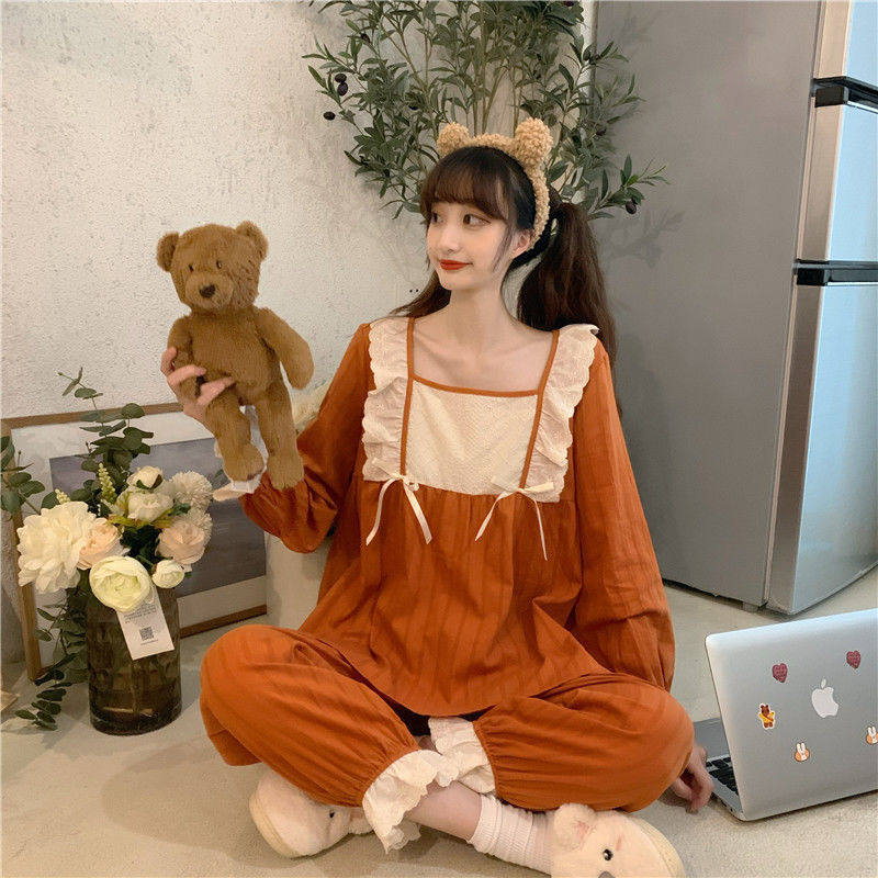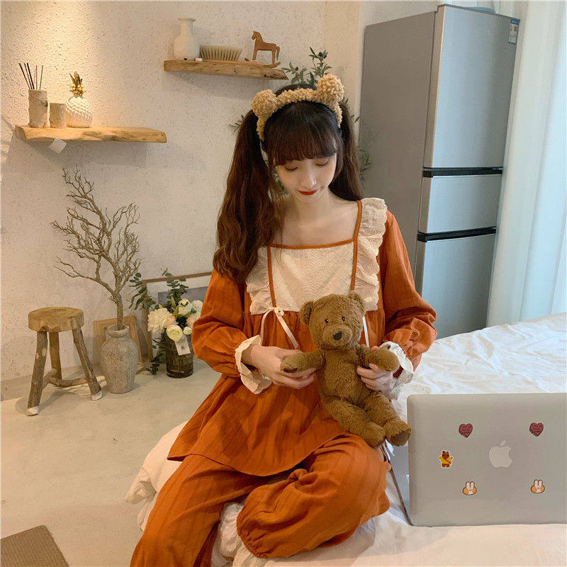 Sleepwear Pants Sets Women's Fall Han Edition Sweet Beauty Lace Princess Wind Sleeping Clothes Loose Dorm Room Wear home Two sets