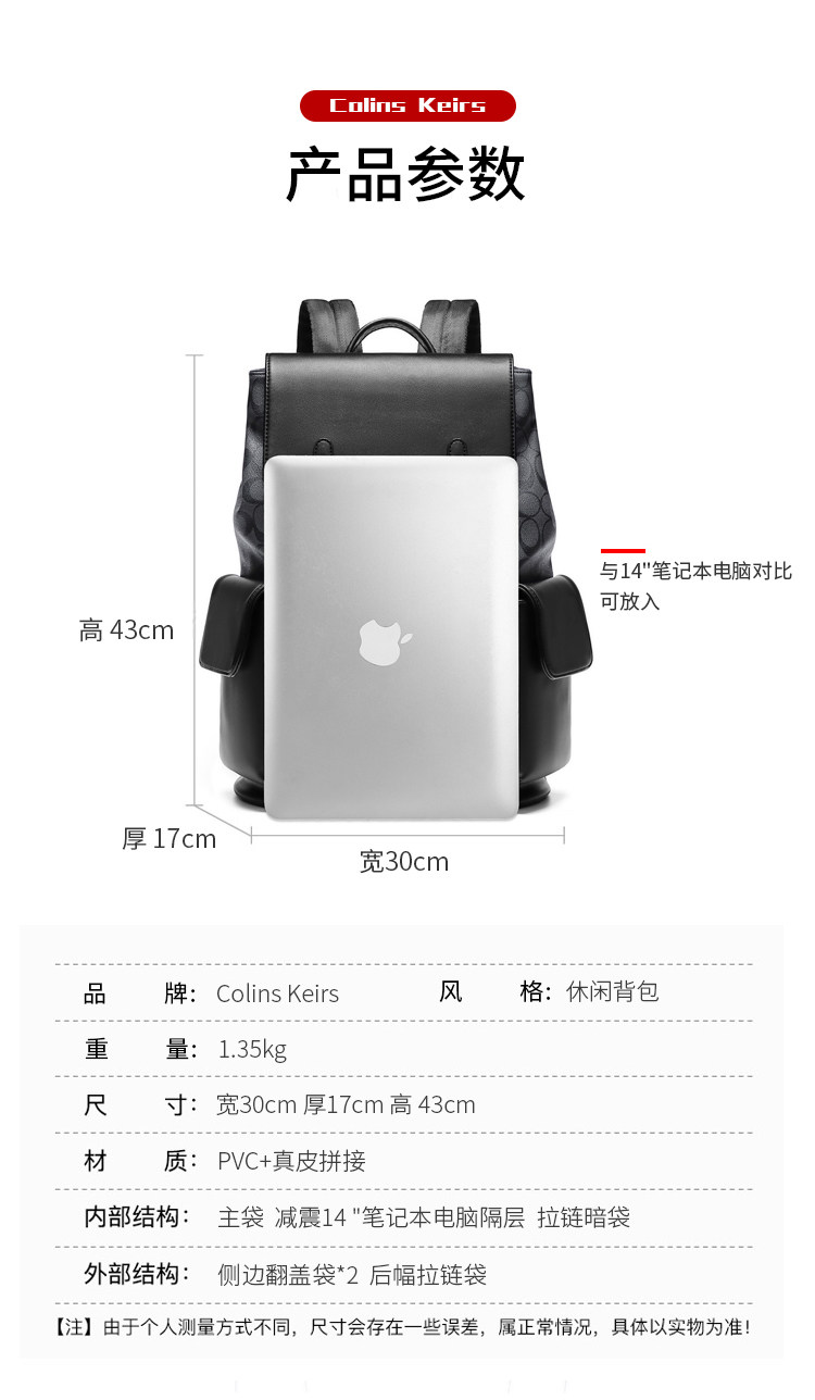 Colins Keirs backpack men's shoulder bag bag male college students fashion trend large capacity leather computer bag
