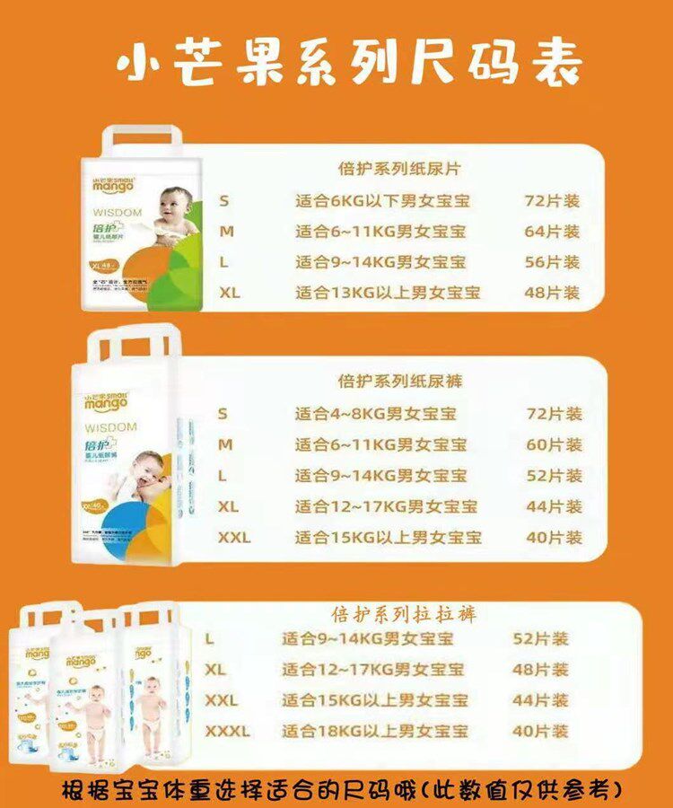 S-size diapers 72 pieces M-size diapers 60 pieces L-size diapers 52 pieces XL-size diapers 44 pieces XXL-size diapers 40 pieces L-size pull pants 52 pieces XL-size pull pants 48 pieces