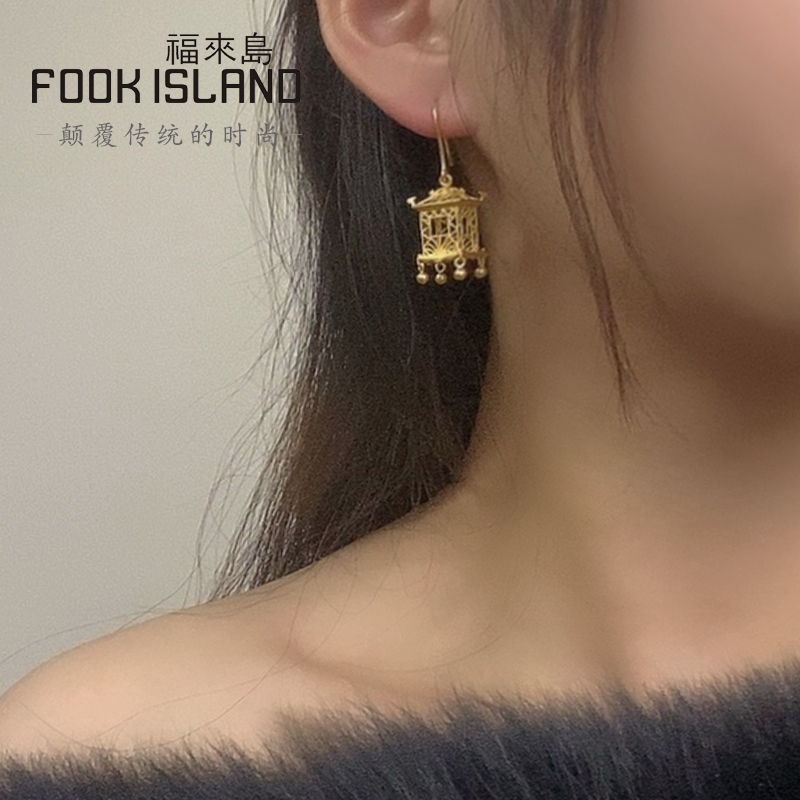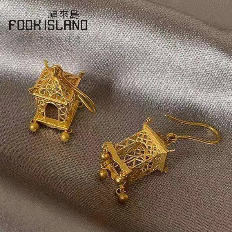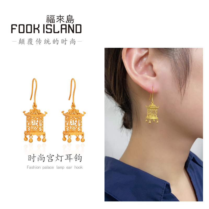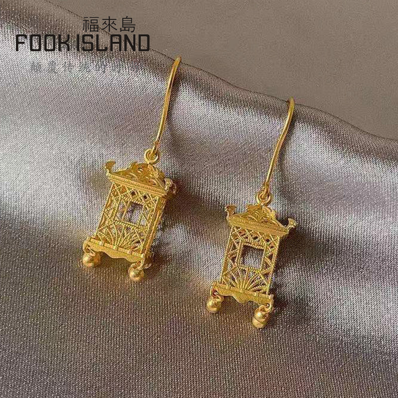 Fulai Island Gold Stud Earrings 999 Pure Gold Earrings Ancient Method Golden Palace Lamp Ear Hook Earrings Pure Gold Earrings Ladies Wedding Earrings