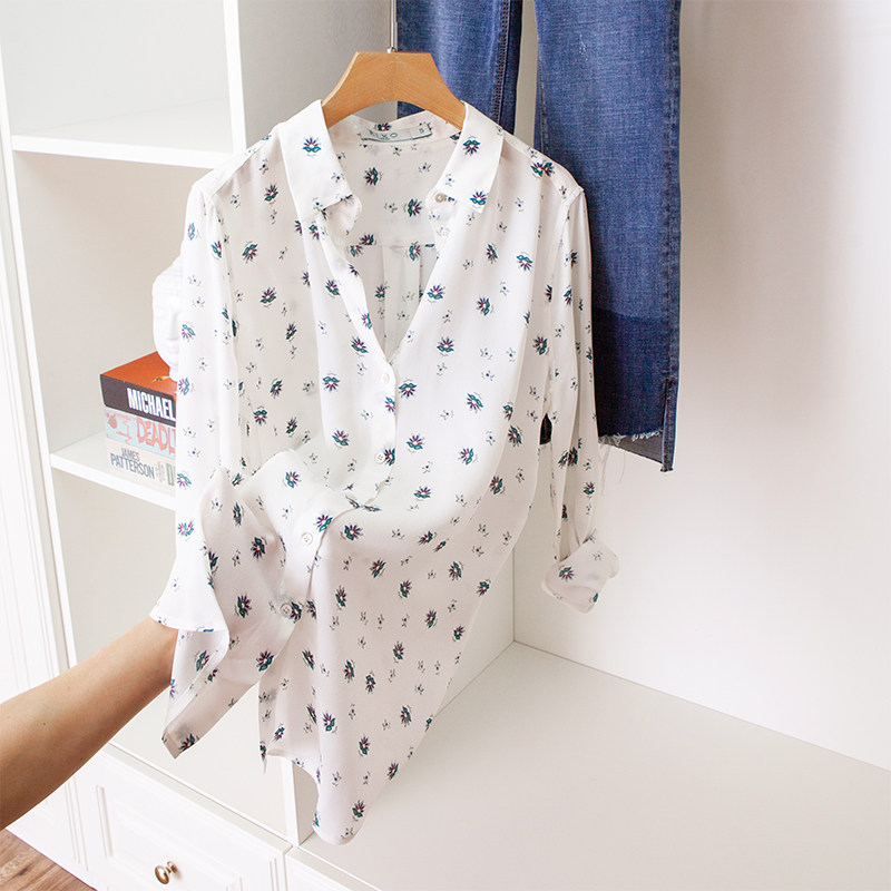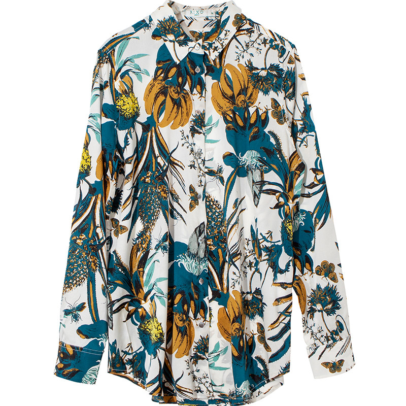 Fresh romantic flower printed in long sleeves with long version of cool and real silk shirt woman 22 spring and summer new x