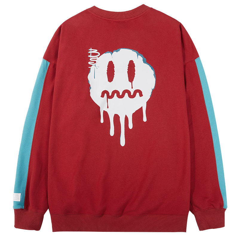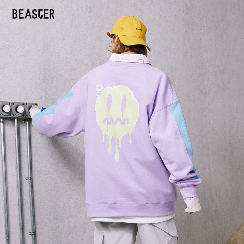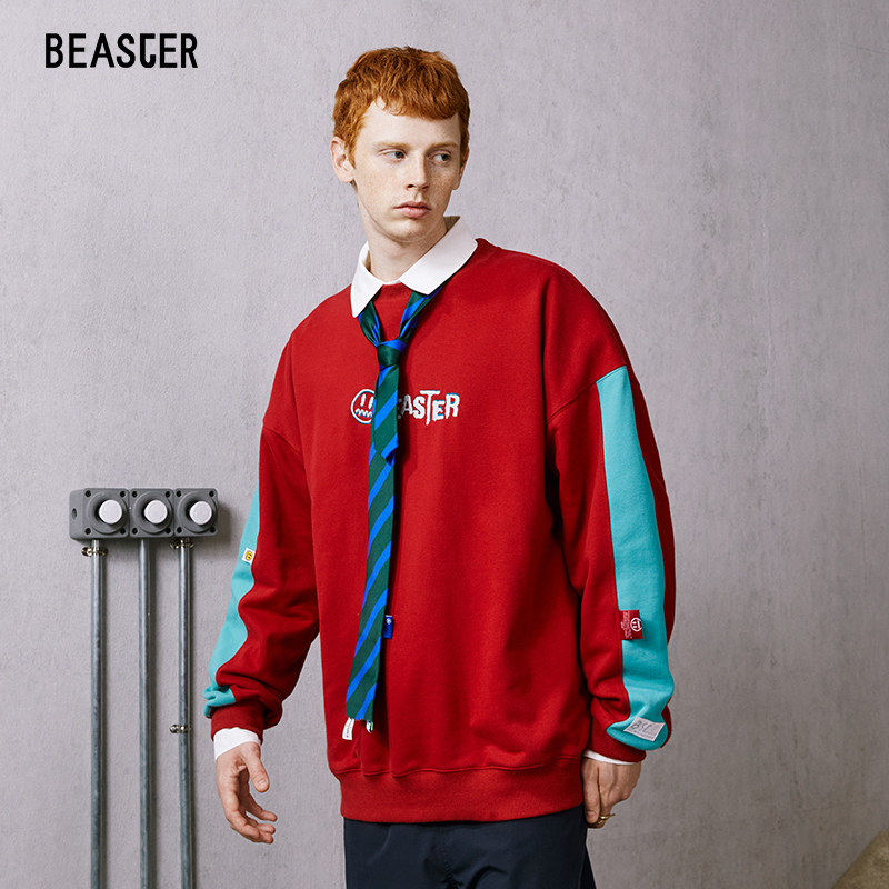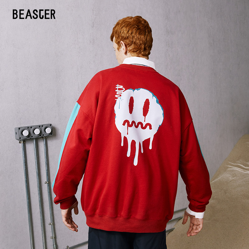 BEASTER Little Devil's Ghost Face Down Shoulder Trend Acropolis Street Tide RELAXED COLLISION COLOR SPLICING ROUND COLLAR SLEEVE HEADS