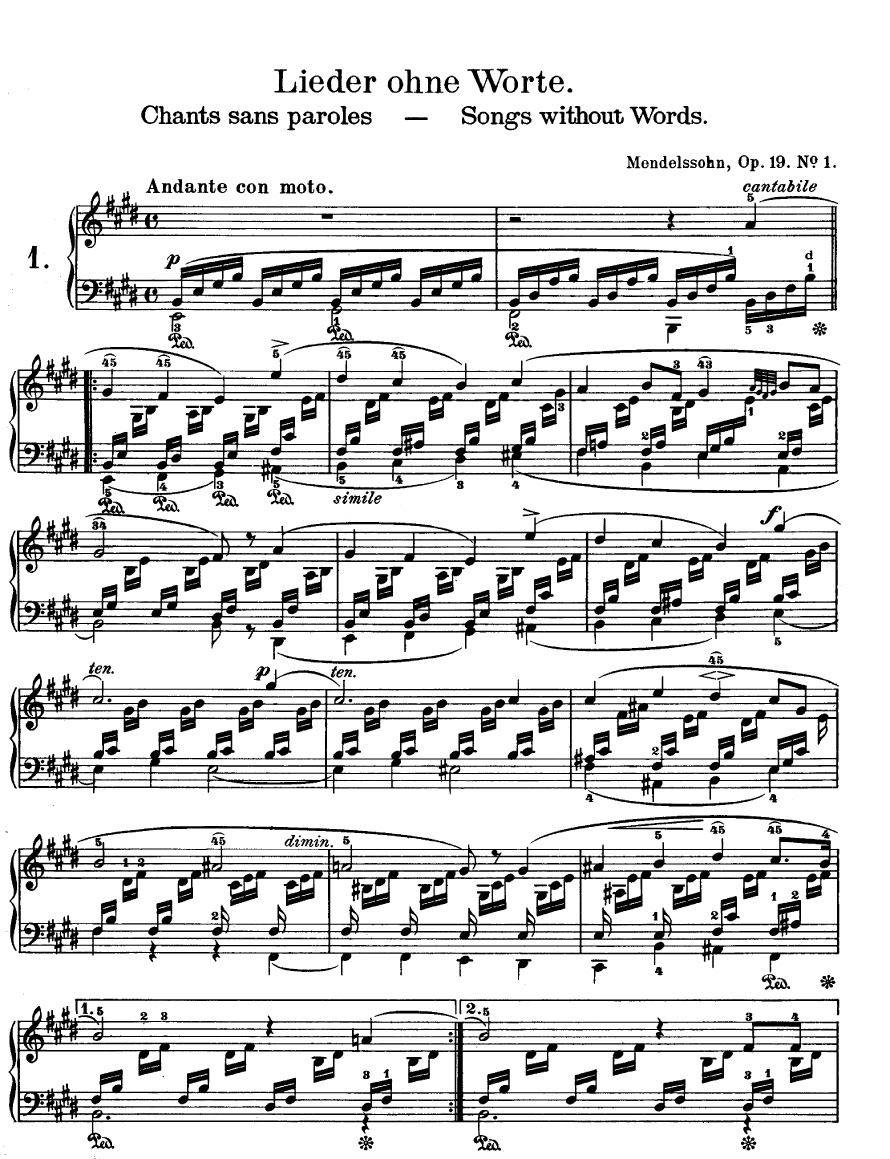 Mendelssohn's piano score without words in E major with fingering Op19-1-3