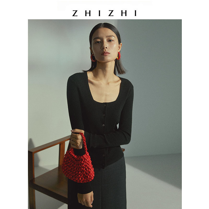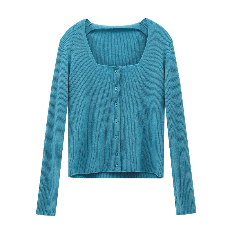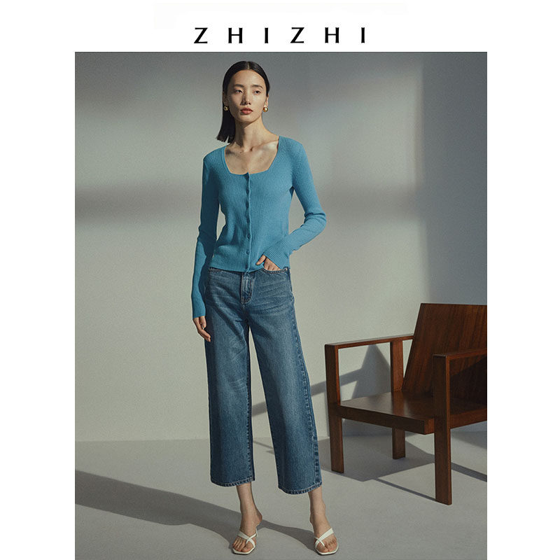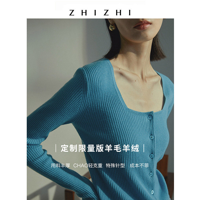 To know ZHIZHI letterhead knit cardiovert cashmere wool knit blouse Women's new low collar retro blue
