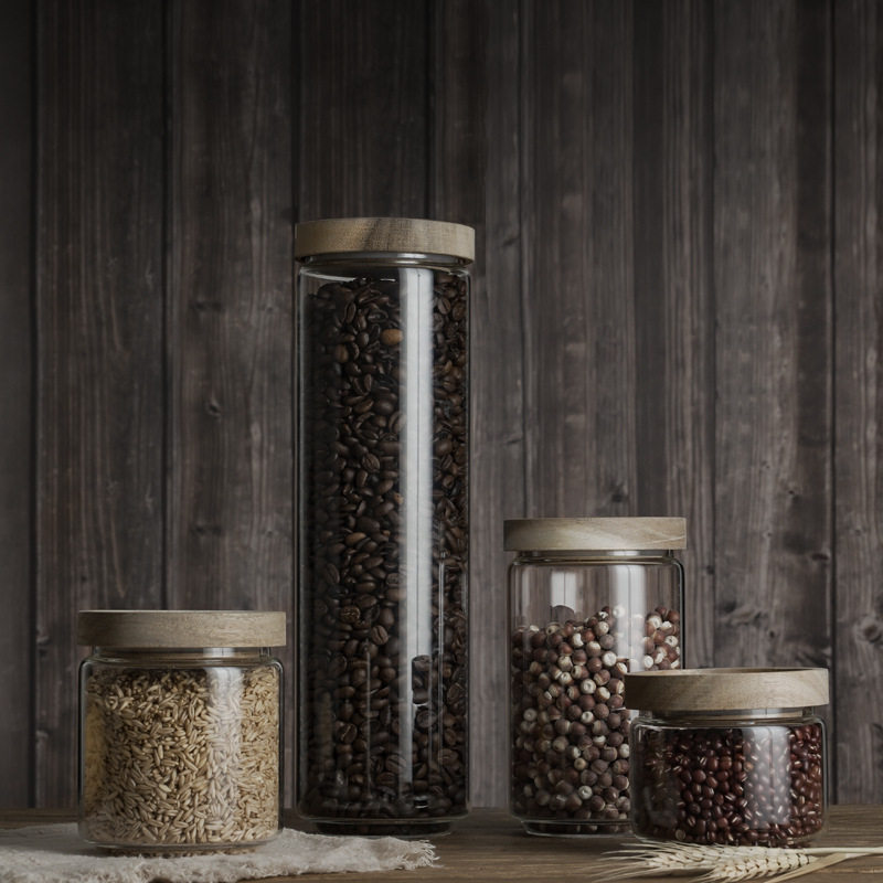 Transparent sealed tank ins net red Acacia wood cover Food grade storage whole grains coffee beans tea storage bottle