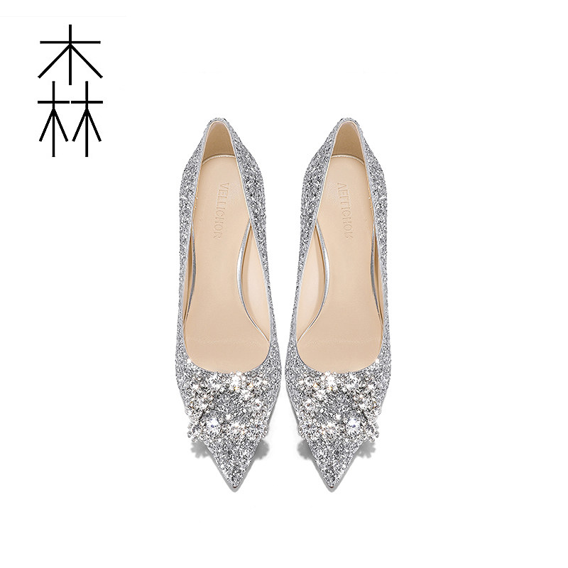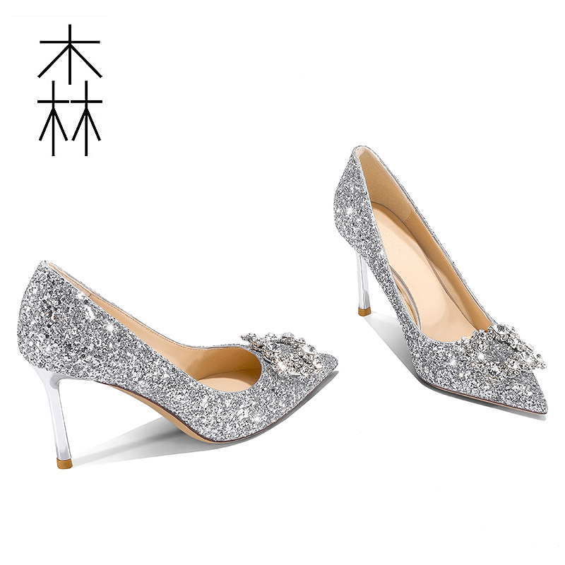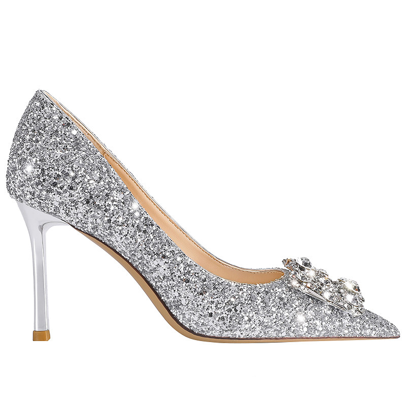 Wedding shoes 2020 new bridal shoes wedding shoes women's sequin square buckle crystal shoes silver high heels stiletto shoes