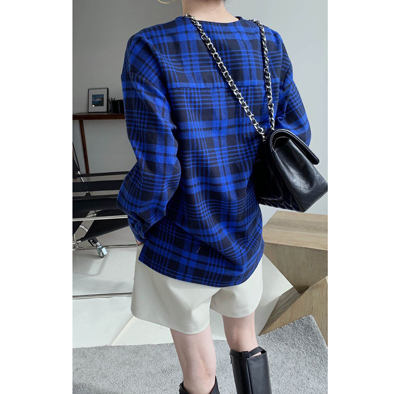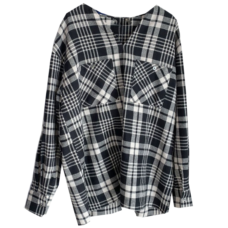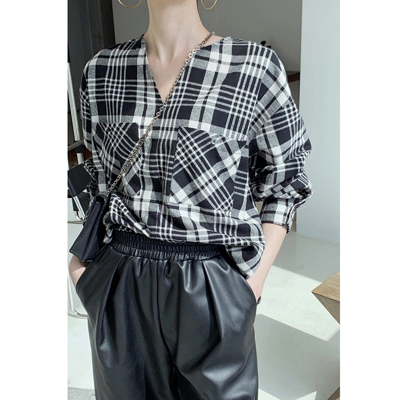 2022 autumn new Korean version simple V-neck double-pocket pullover suede plaid shirt women's loose casual top