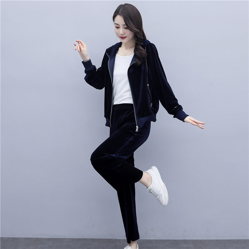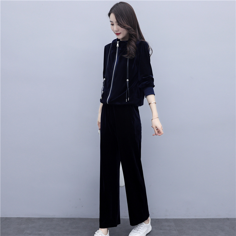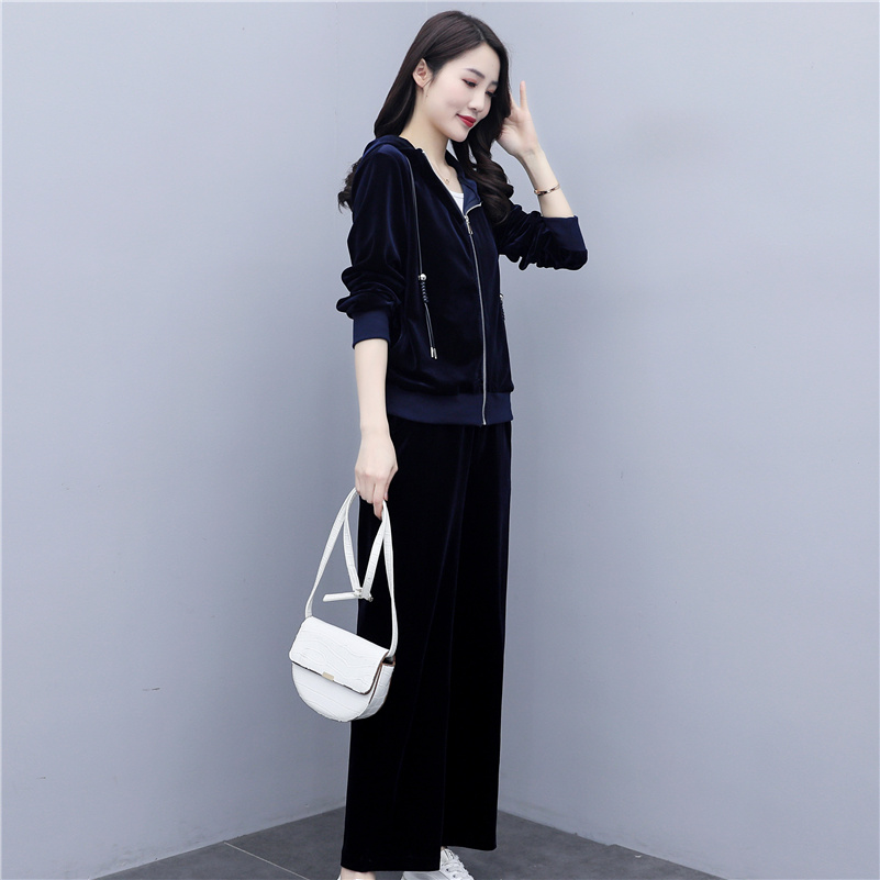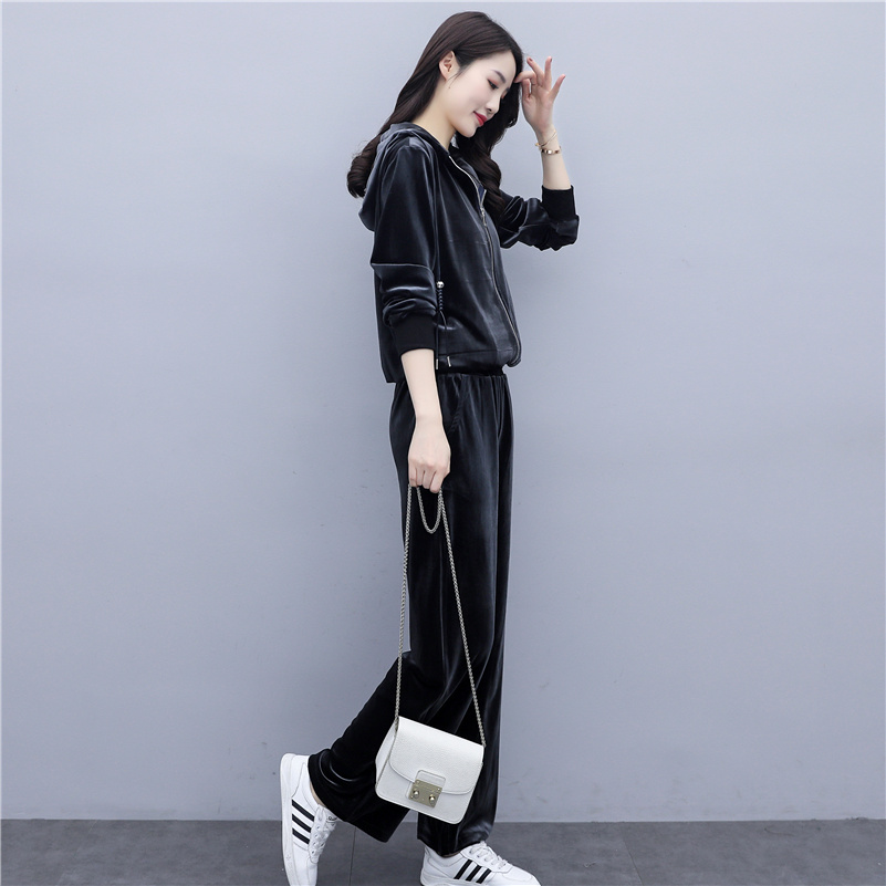 Golden Velvet Sweater Kit Female 2021 Spring New Link Casual Hat Wide Leg Trouser Two Pieces