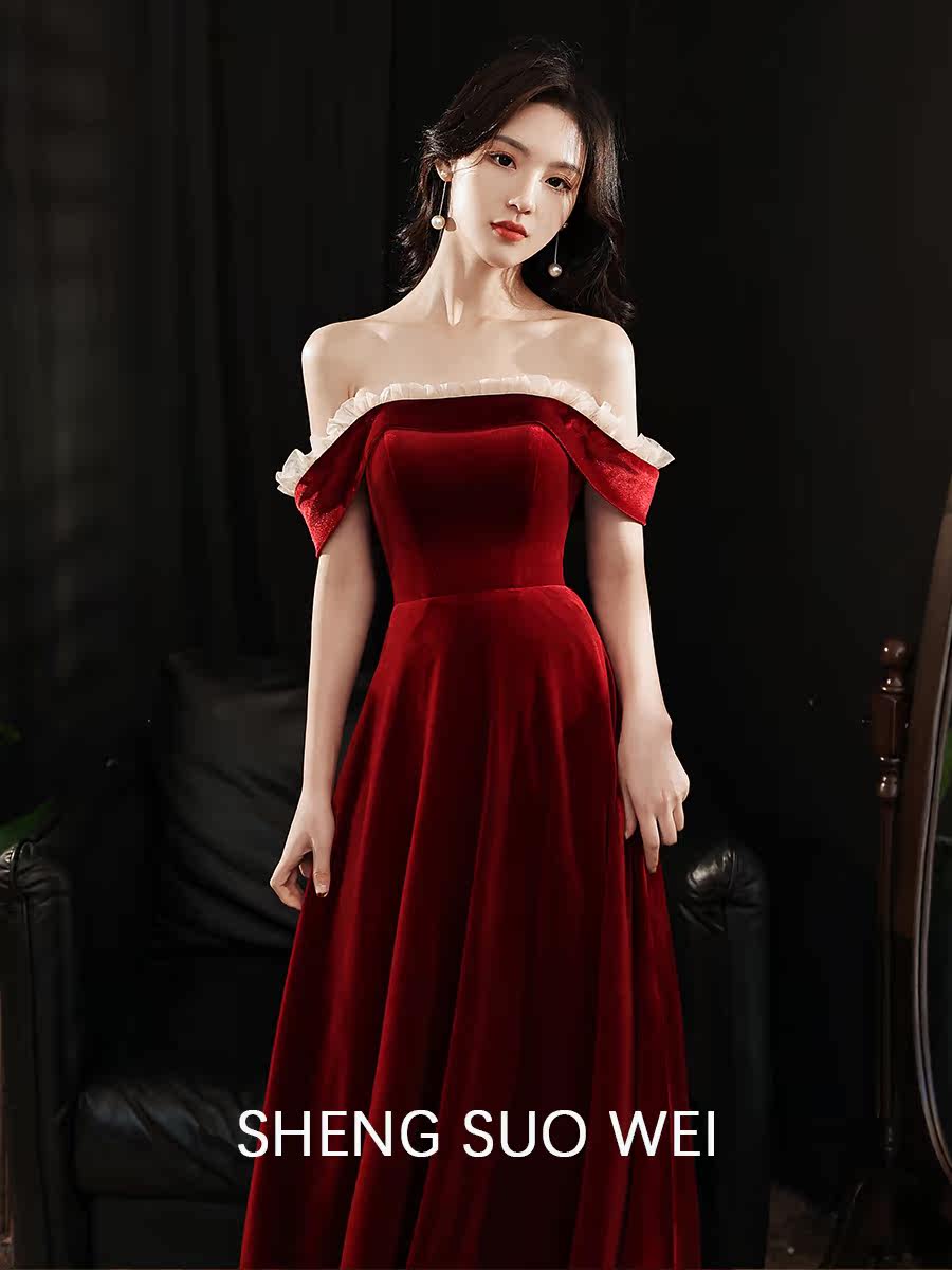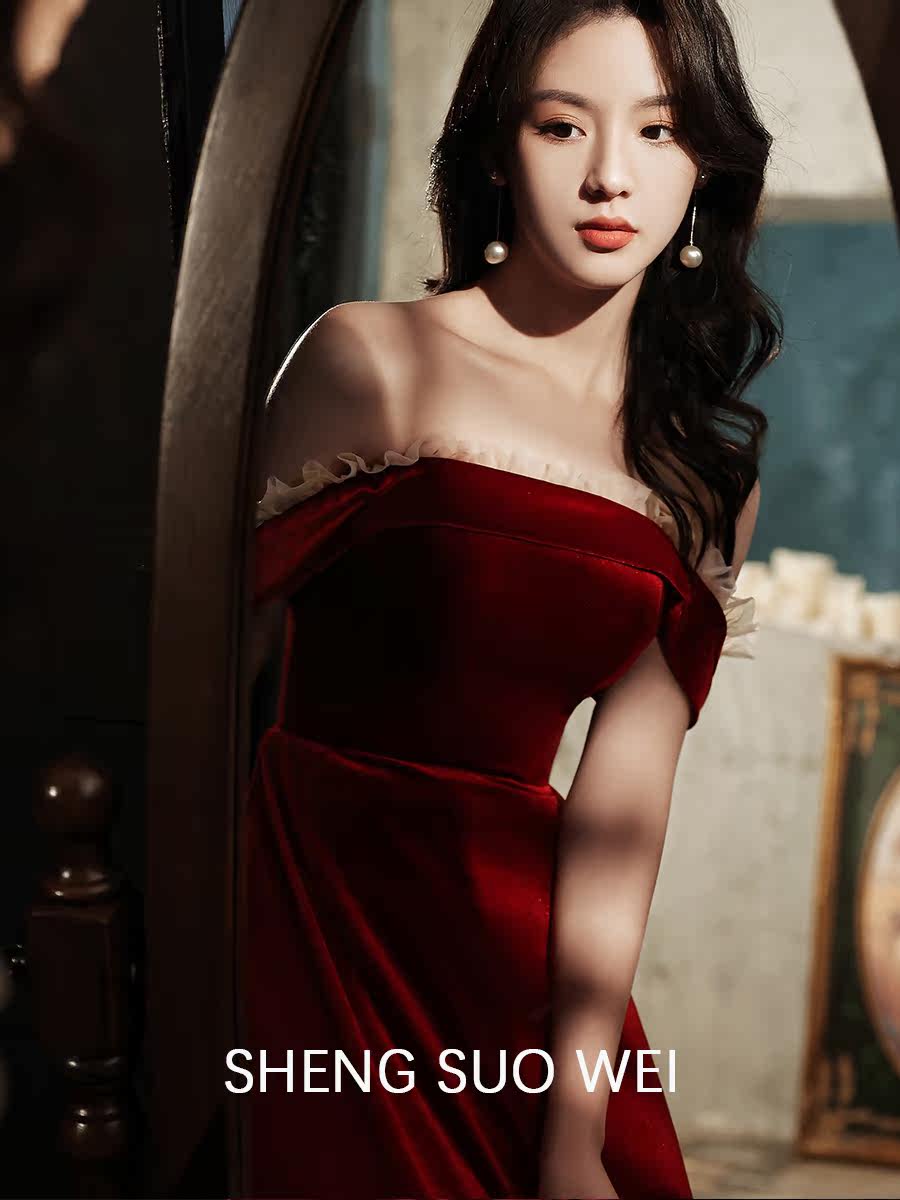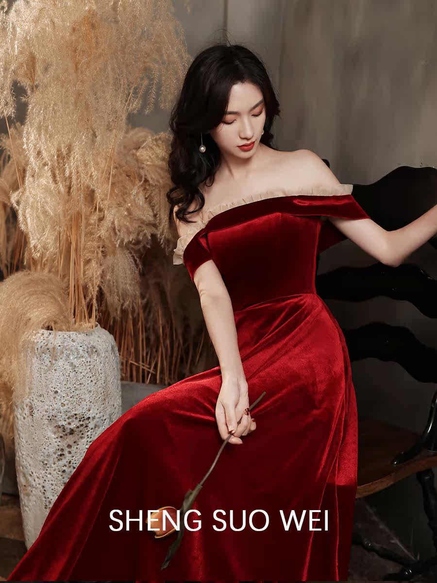 Wine red slim-fit velvet toast dress bride 2021 new temperament slim high-end texture engagement wedding dress female