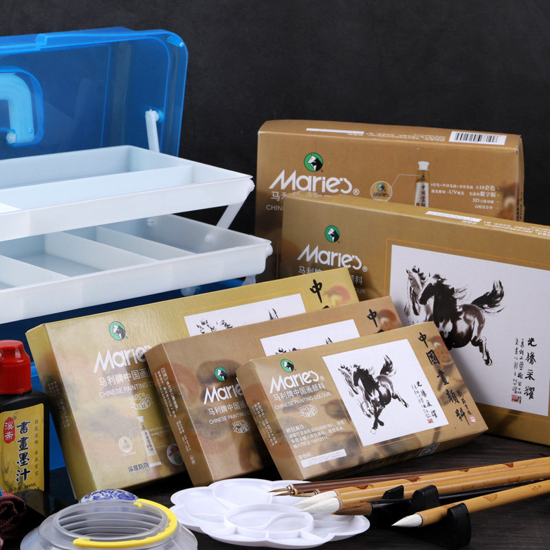 Mali brand Chinese painting pigment 12 colors beginner Chinese painting coloring paint primary school students brush with children's painting introductory material with toolbox 24 colors 36 colors into artificial stroke writing dedicated