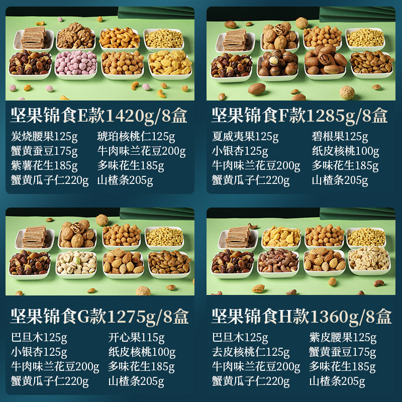 Nut Brocade A 1285g 8 boxes (Badanmu Macadamia nuts) Nut Brocade B 1400g 8 boxes(Badanmu Kernel cashew nuts) Candied brocade C 1555g